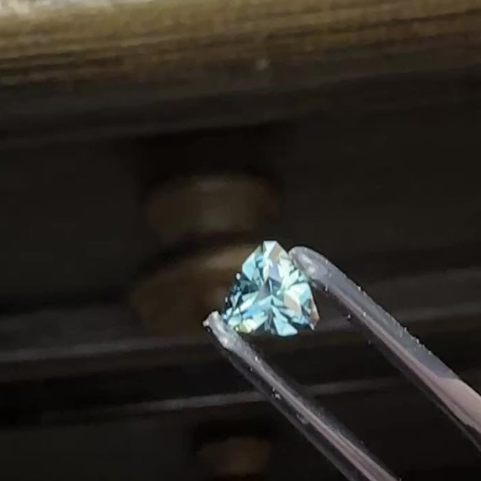 A truly remarkable little gemstone from Nigeria! A gorgeous Gombe Sapphire, unheated and loupeclean showing some beautiful bright blues in a very lively and well cut stone!! It’s a gorgeous superbly polished sapphire, and is sure to thrill its new owner! A ocean blue gem in a gorgeous sharply cut trillion, precision cut by me! Will be the highlight of your next jewelry project!