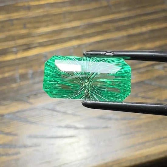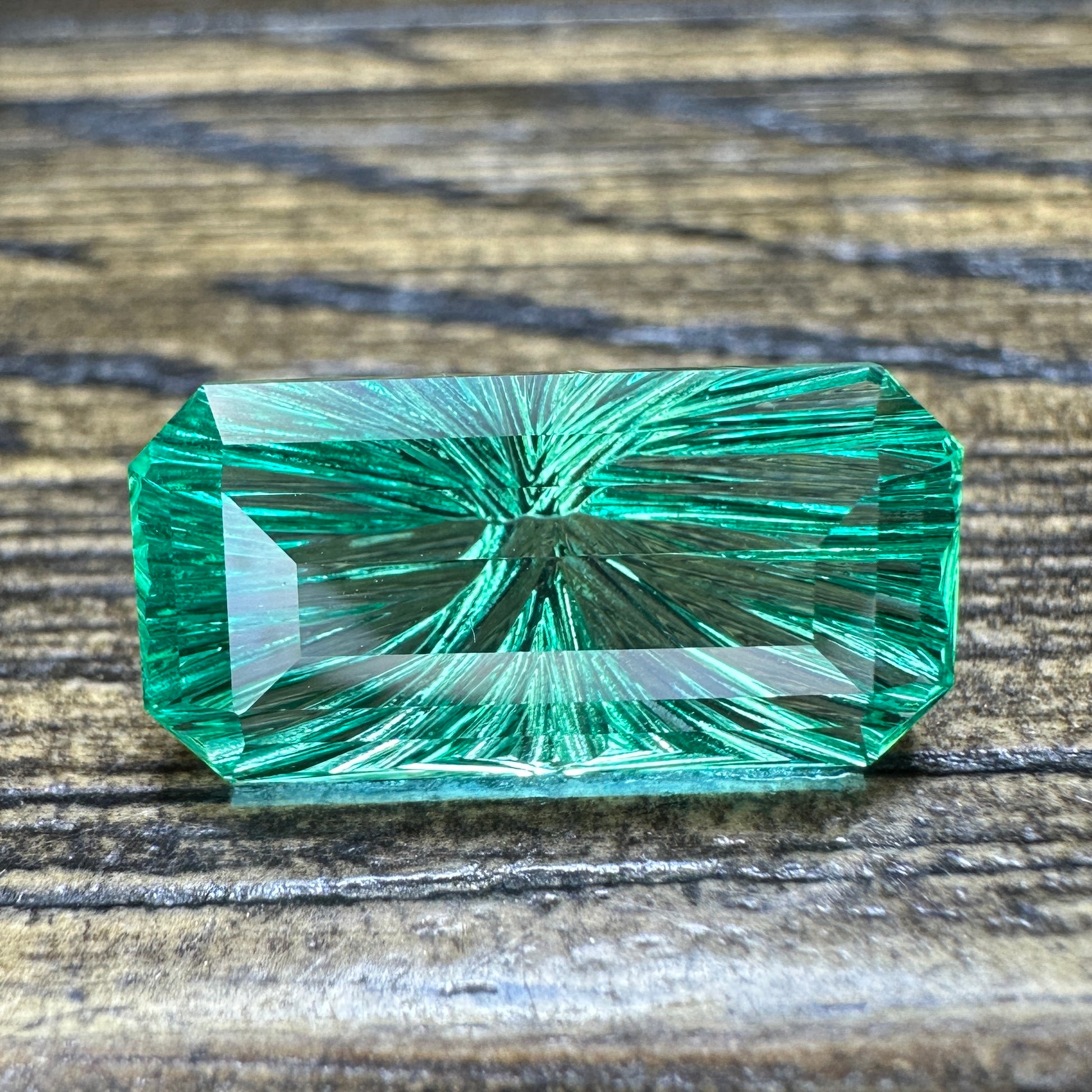 Offered here is an absolutely phenomenal fantasy cut cobalt green sapphire with fine streaks of blue dots under a scope!! Eyeclean, blue blebs are hard to see. It’s a bright gorgeous lab created gem, and is guaranteed to thrill its new owner!
