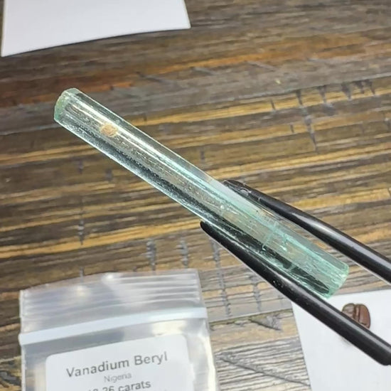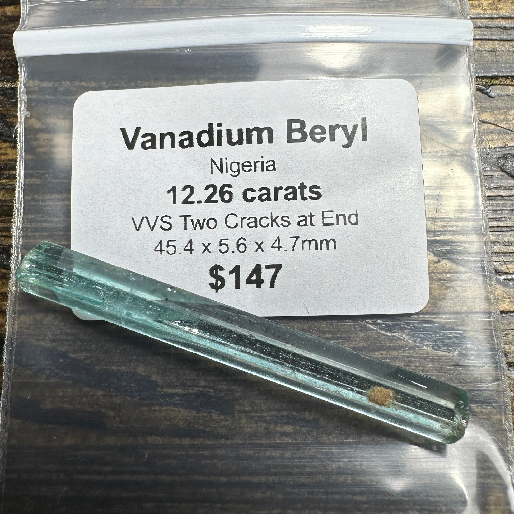 Typically lightly saturated Nigerian Vanadium Beryl with a good shape! Mostly clean with two thin crack lines at one end of this long crystal.