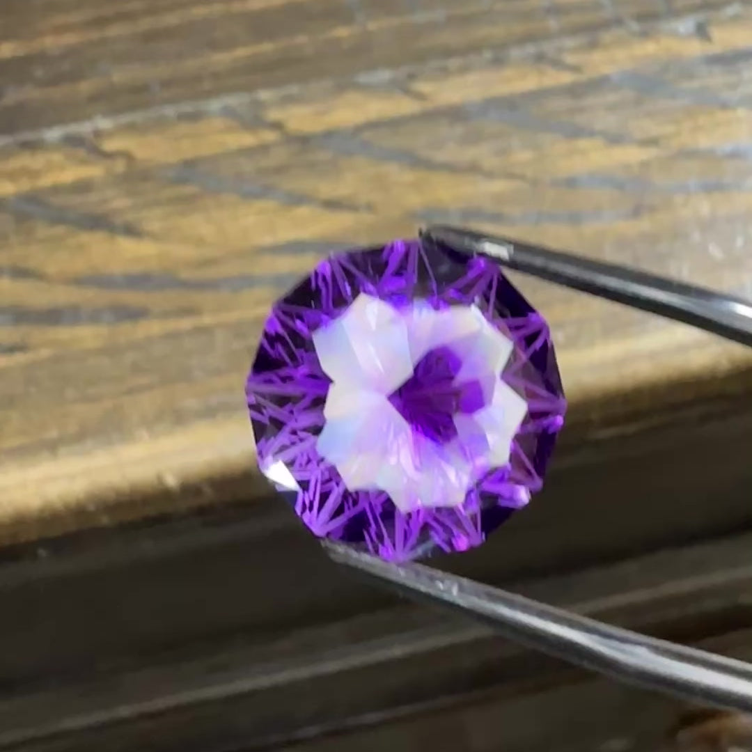Offered here is a high facet count cut from me of an Amethyst gemstone, cut by me, in a design that is really unique!! It’s a gorgeous eyeclean gem, a few scuffs on some facets to note, and is guaranteed to thrill its new owner!