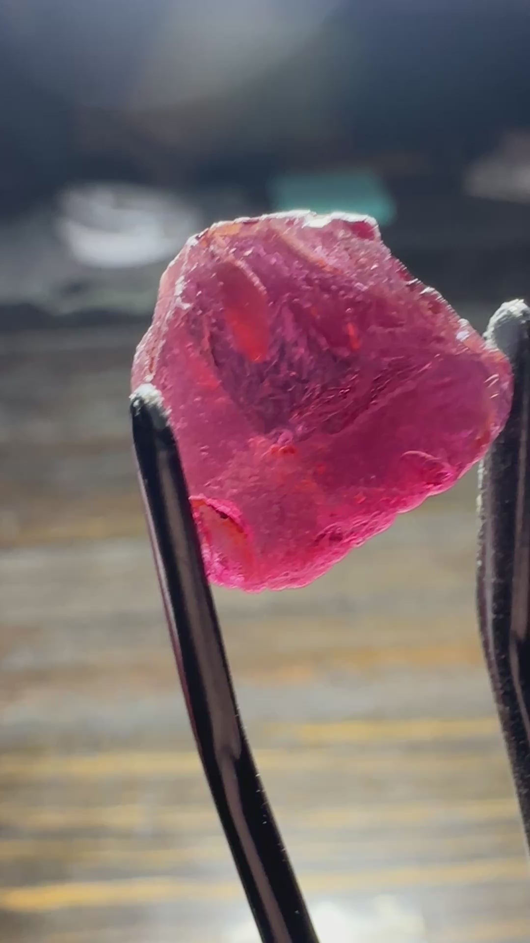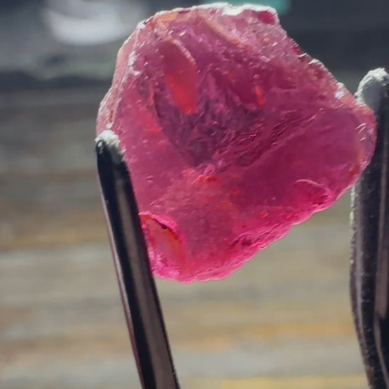 Beautiful open pink color Tanga Rose Garnet from the 2024 find with a perfect trillion shape and i see no sugars BUT there is a feather to avoid, as shown in video!!! From a batch I recently purchased at high cost, but of excellent quality; none of those pesky sugar bombs and phenomenal open color!!! Truly a large, excellent cutter!