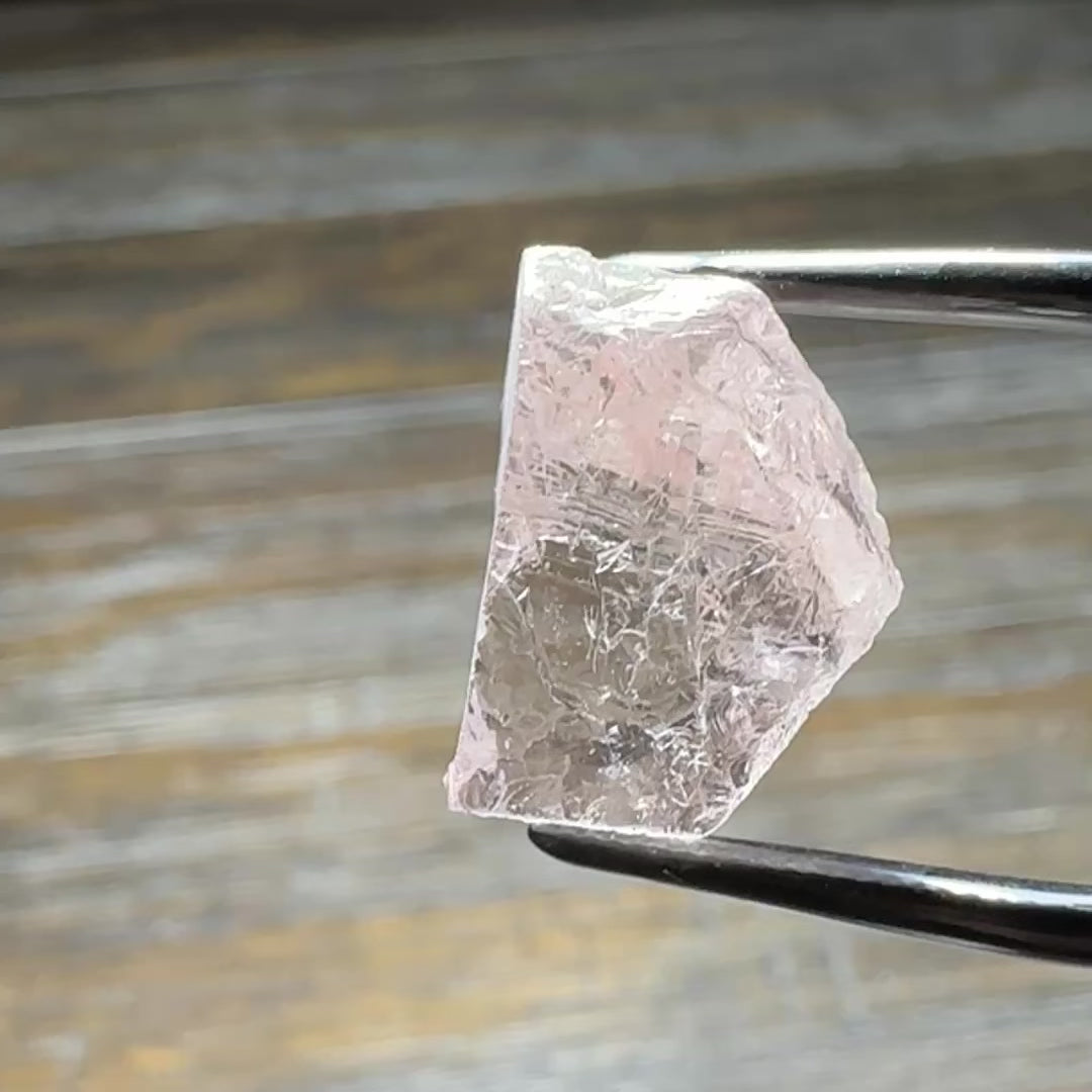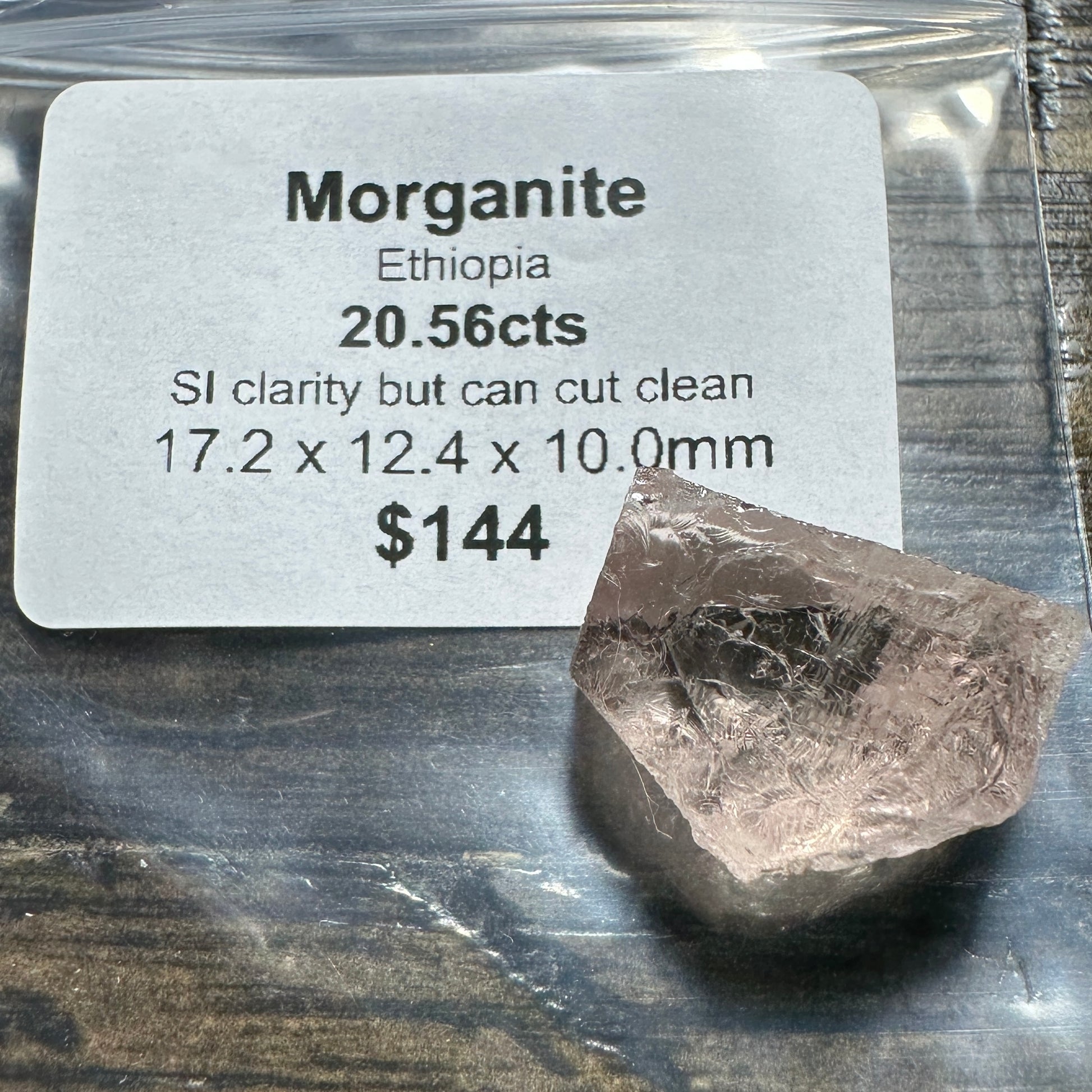 Beautiful peachy pink Ethiopian Morganite with good size and shape. Mostly eyeclean. A tiny bubble and a small crack at one corner is easy to work with. Will cut a gorgeous gem.