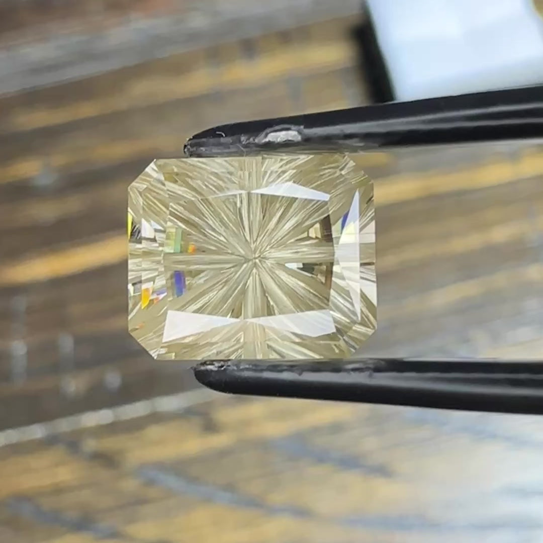 Offered here is an absolutely phenomenal fantasy cut moissanite with fine needle inclusions!! Eyeclean, needles run straight up and down so they are hard to see. It’s a bright gorgeous lab created gem, and is guaranteed to thrill its new owner!