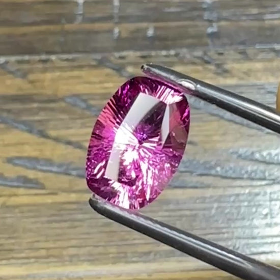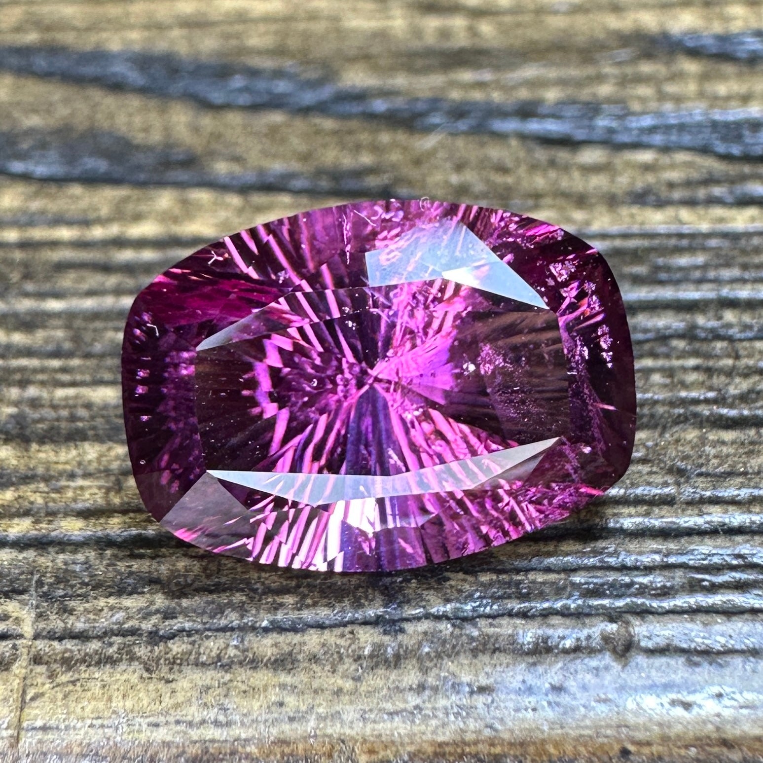 A superb unique concave cut Tanga Garnet in a beautiful cushion rectangle!!! A bit dark at each end and bright in the middle. A few sugar inclusions within. Really nice fantasy cut design that is superbly polished; It’s a gorgeous garnet, and is sure to thrill its new owner!