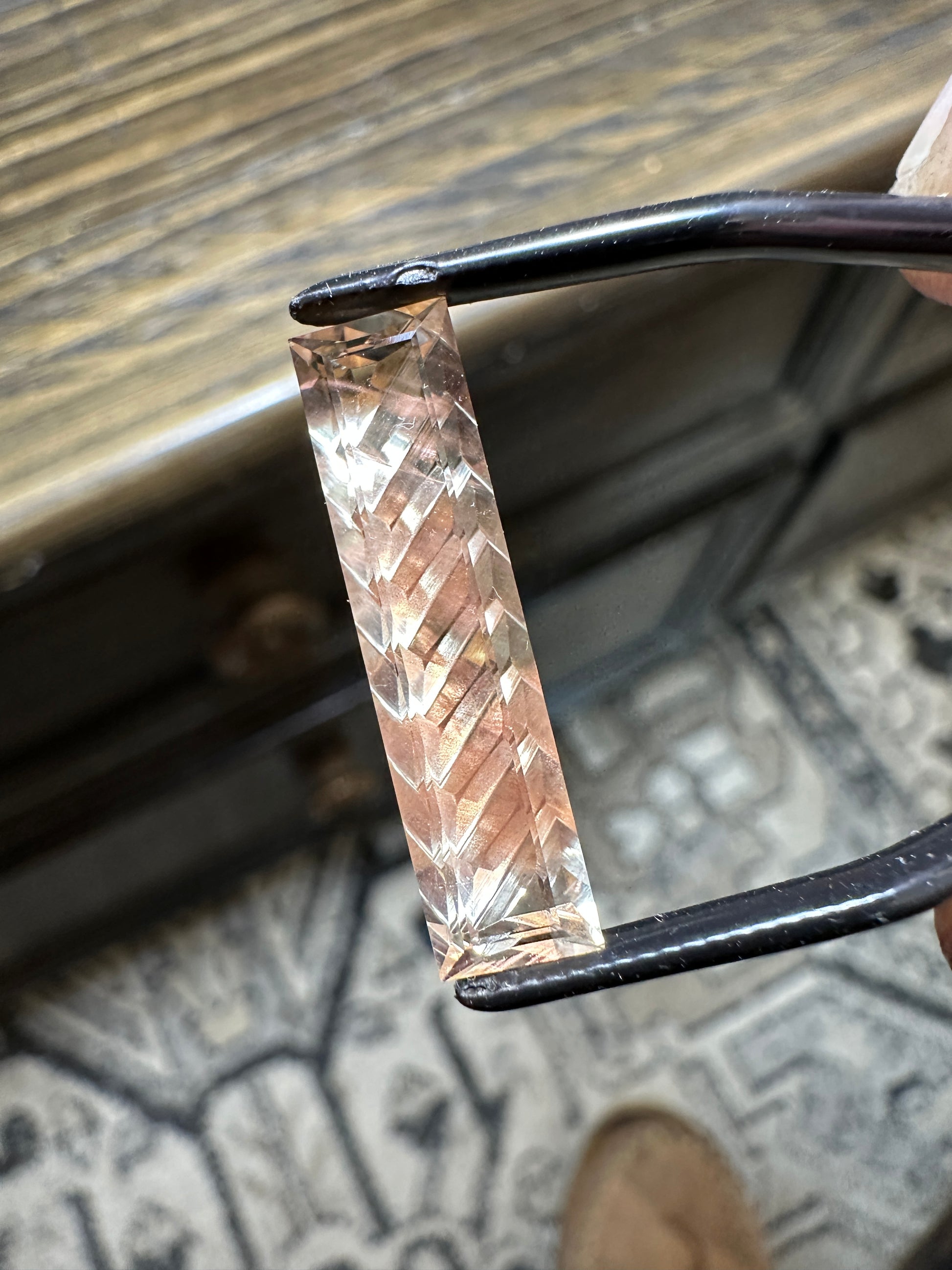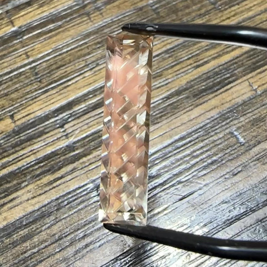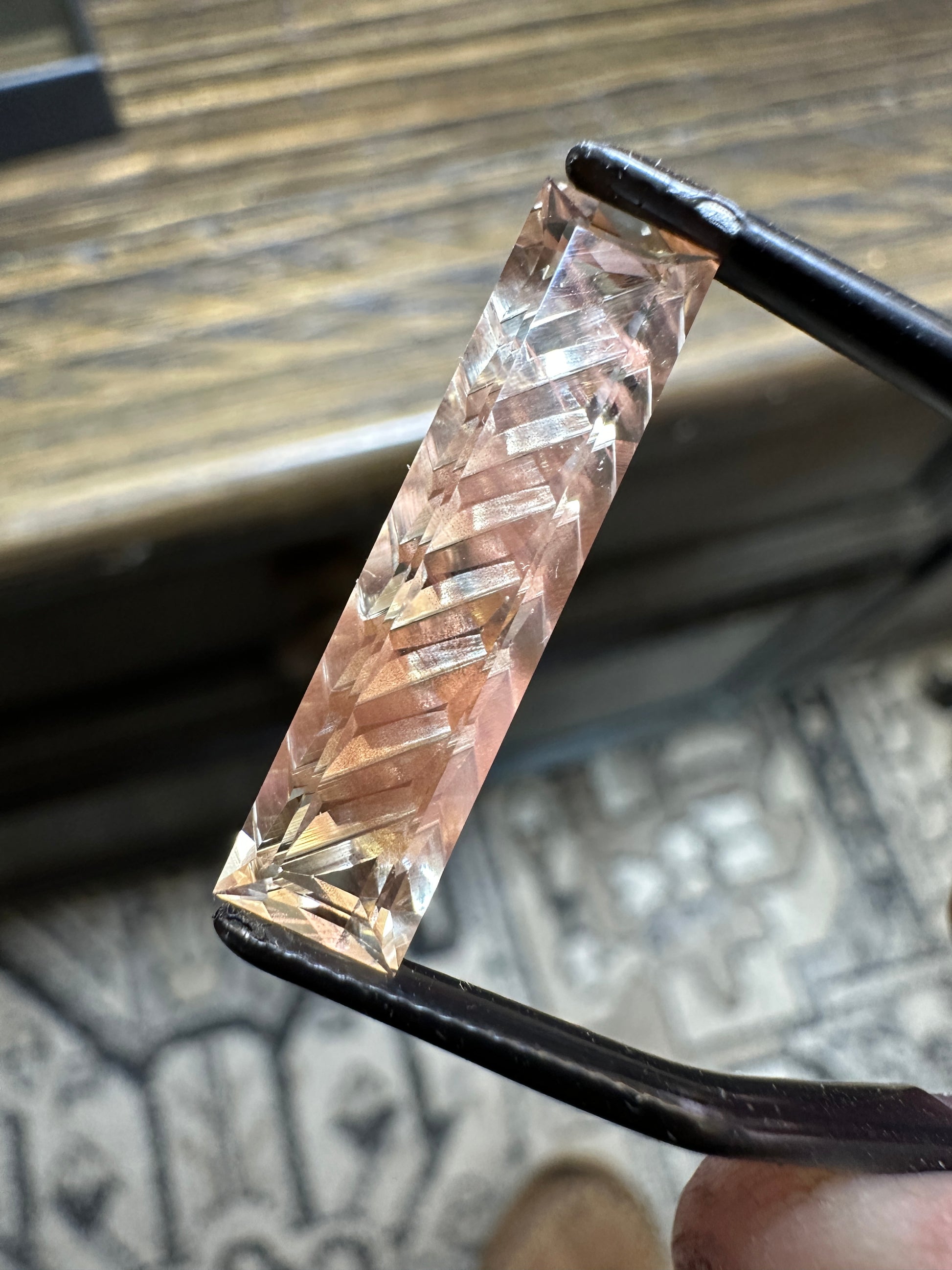 Stunning “basket weave” sliced cuts on the pavilion of a schiller loaded Gold Sunstone with an excellent rectangular step cut shape!! It will make a phenomenal custom piece of jewelry!!!