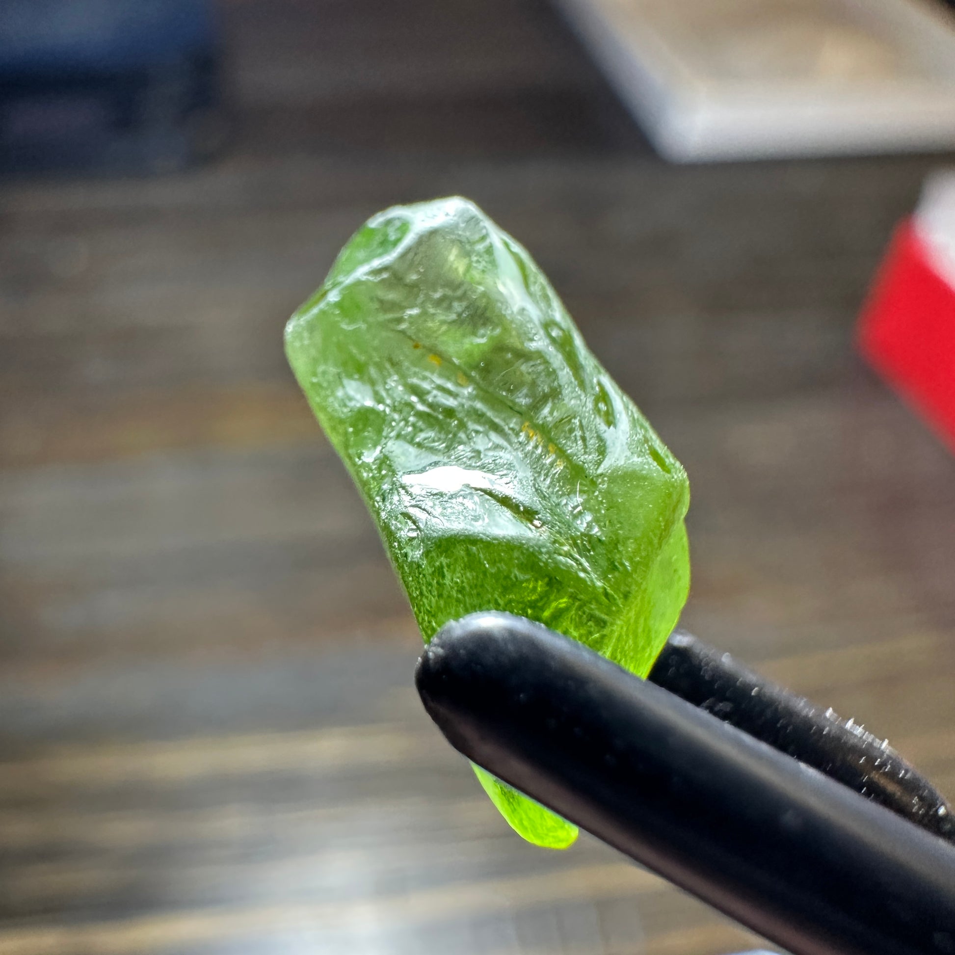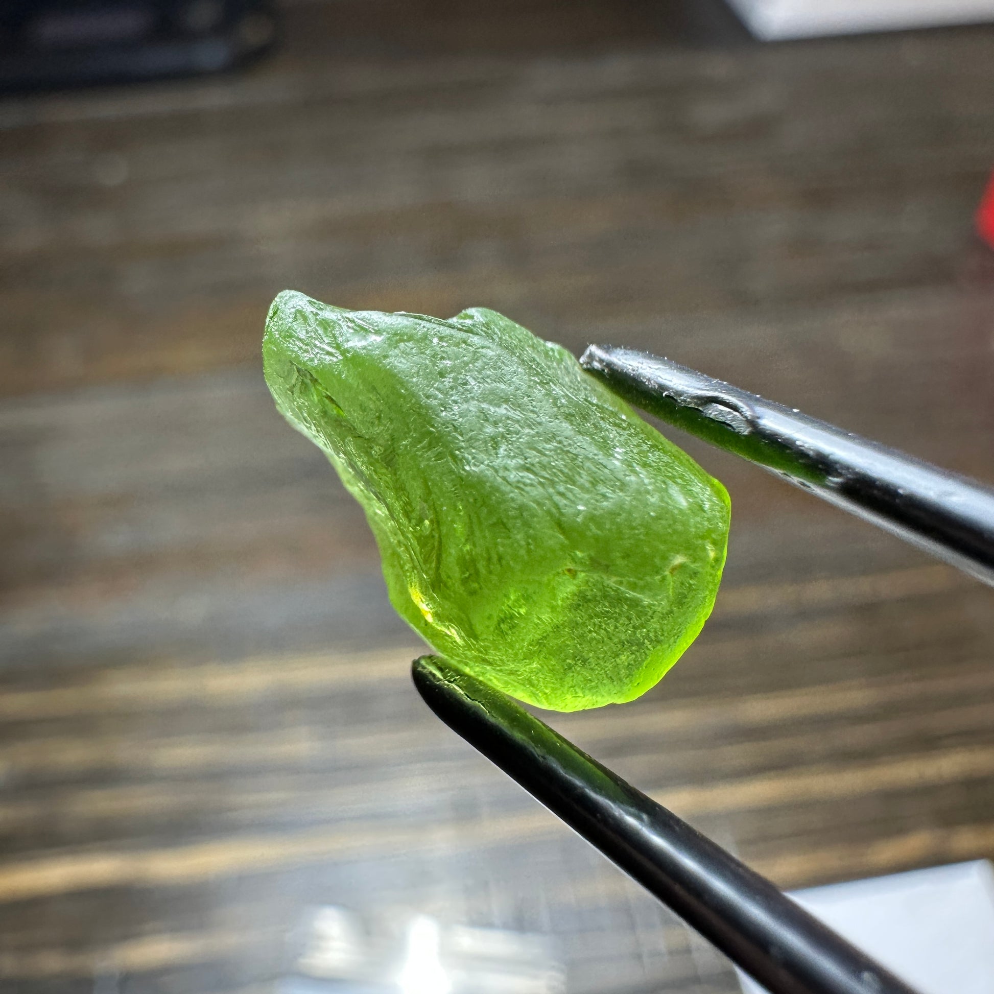 Good size and shape; looking to be eyeclean rough of the newer Tanzanian Peridot. These are the most vibrant Peridot I have handled and they cut very bright gems! A nice opportunity at a great gem to cut!
