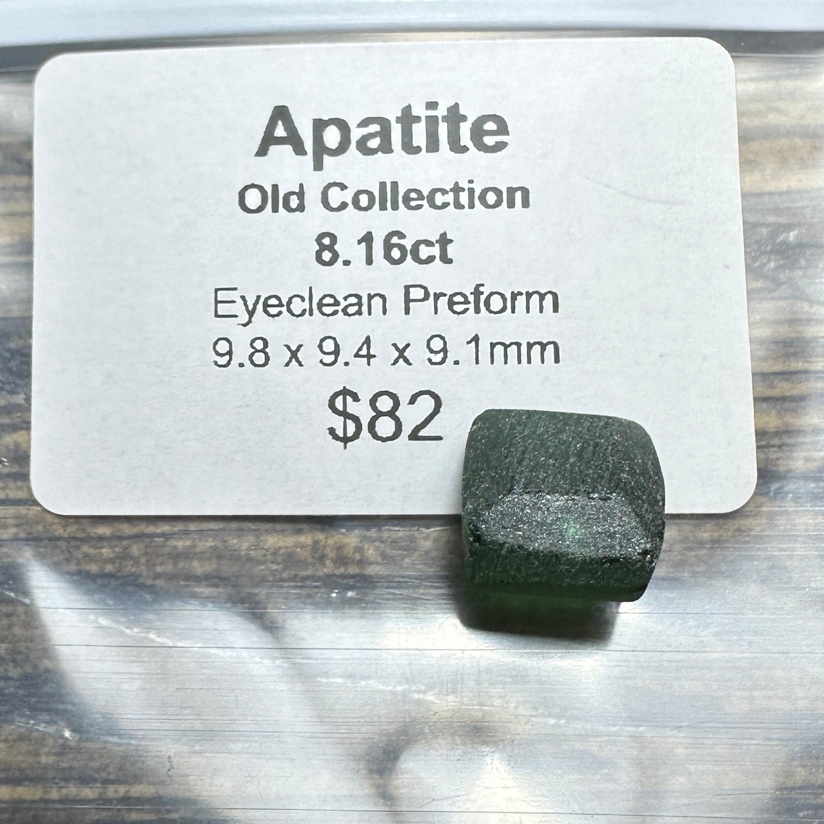 Preformed green apatite out of an old collection so no information on treatments or locality. Excellent color! NOTE!!! I MARKED AS EYECLEAN…THEY ARE INCLUDED UPON SECOND INSPECTION!!! But still entirely cuttable!