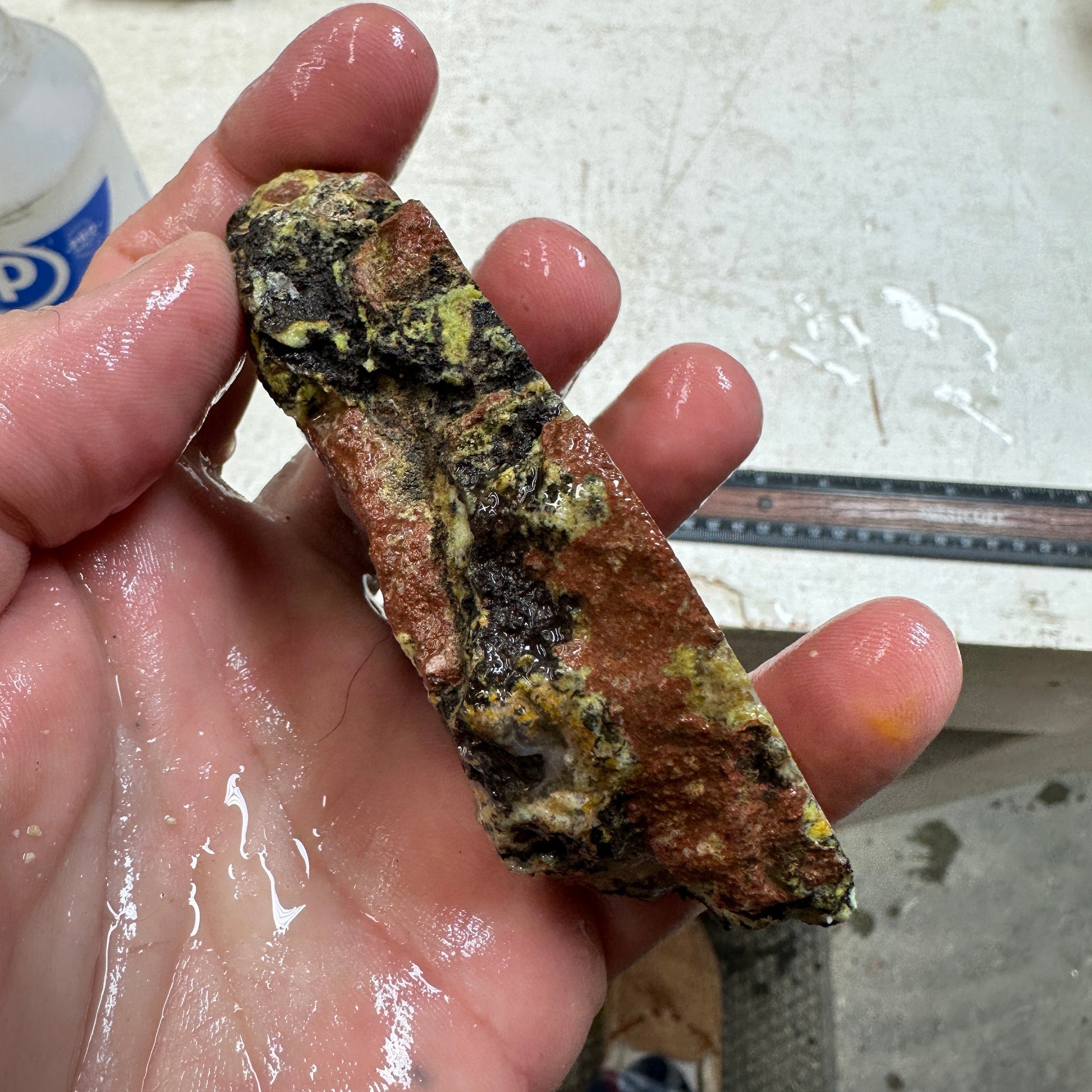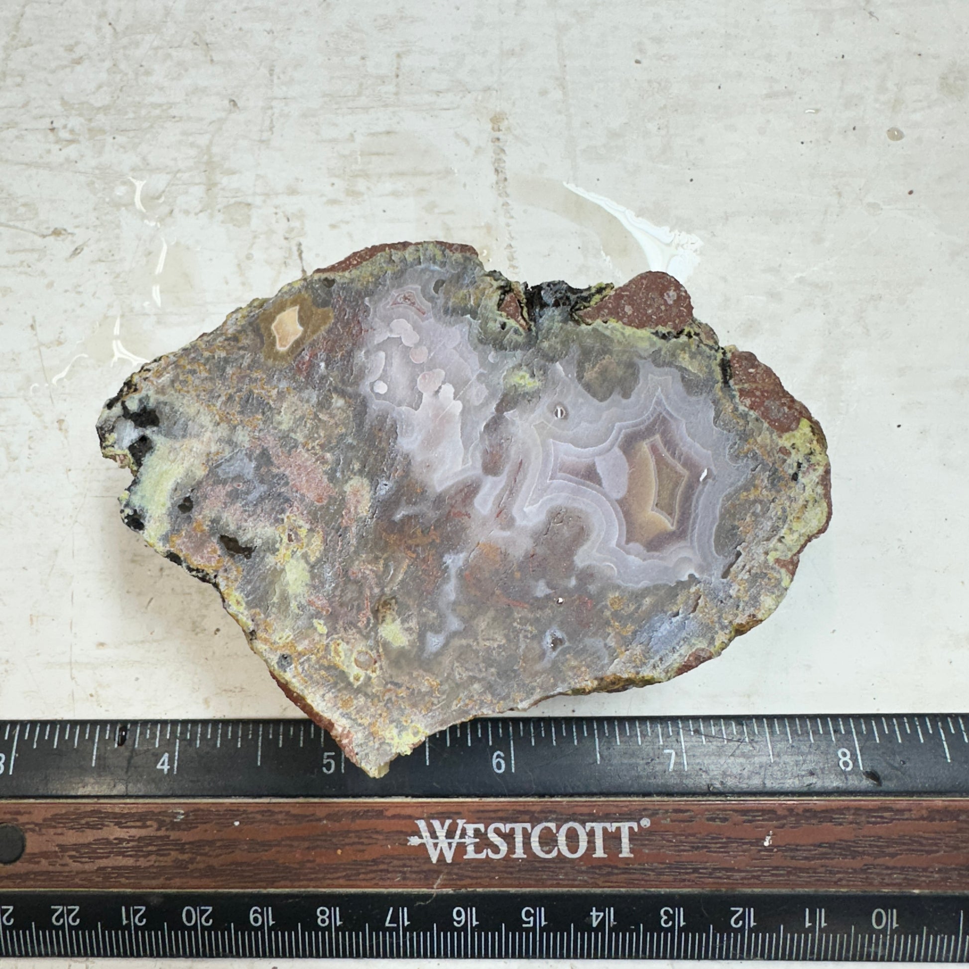 Classic higher grade half nodule with psychedelic red/yellow/white bands within mossy filaments! Excellent quality for cutting.
