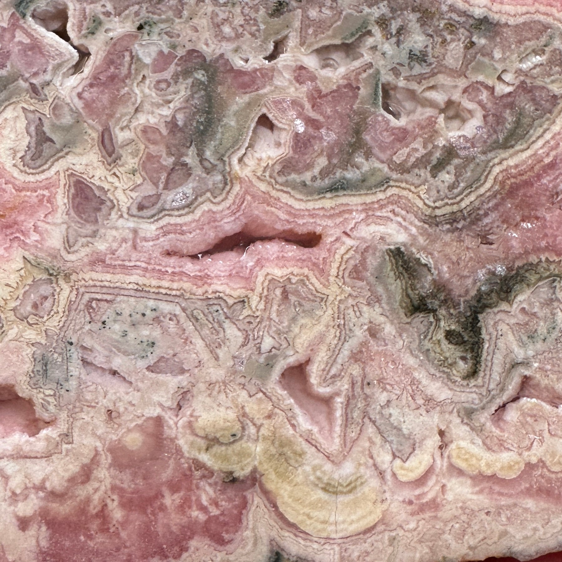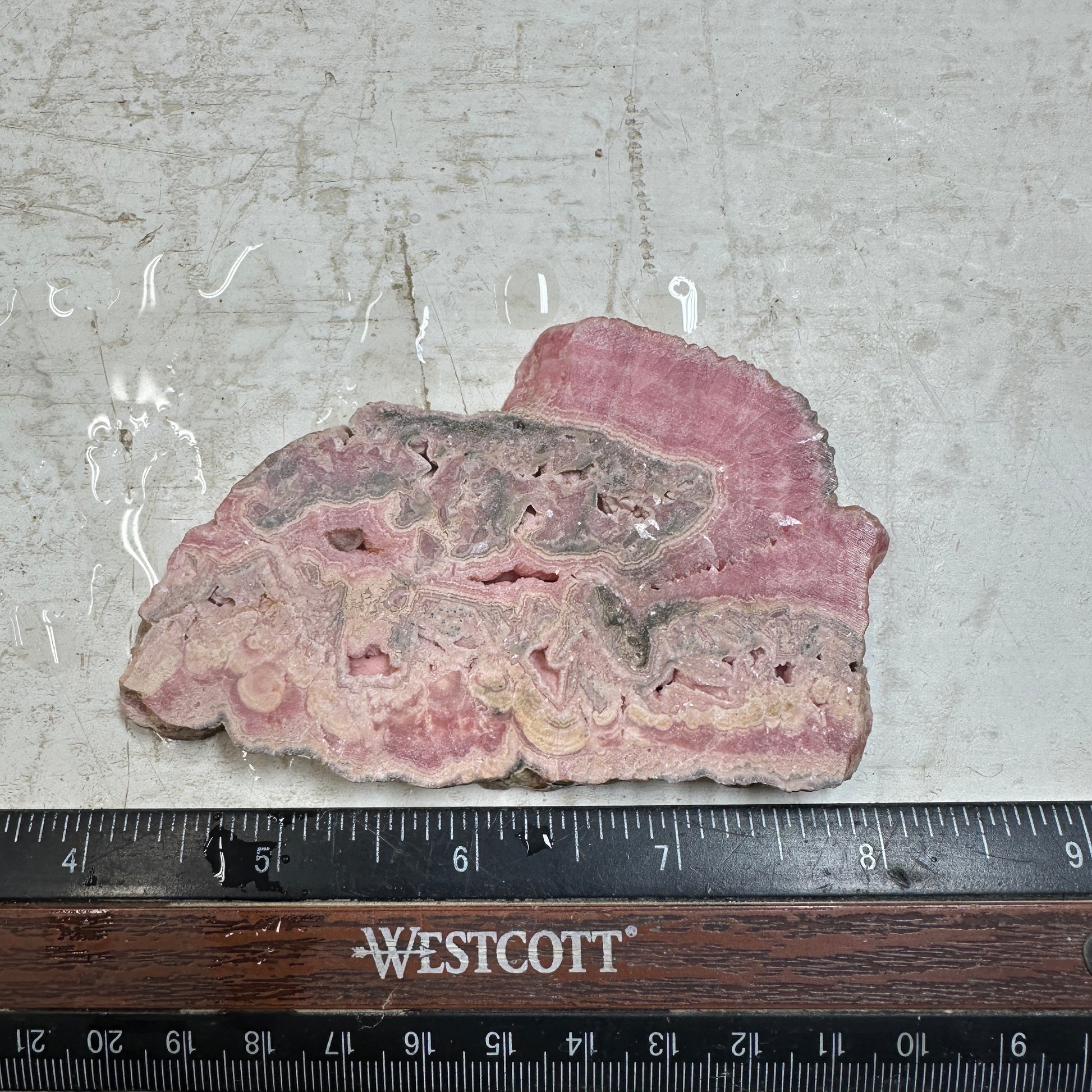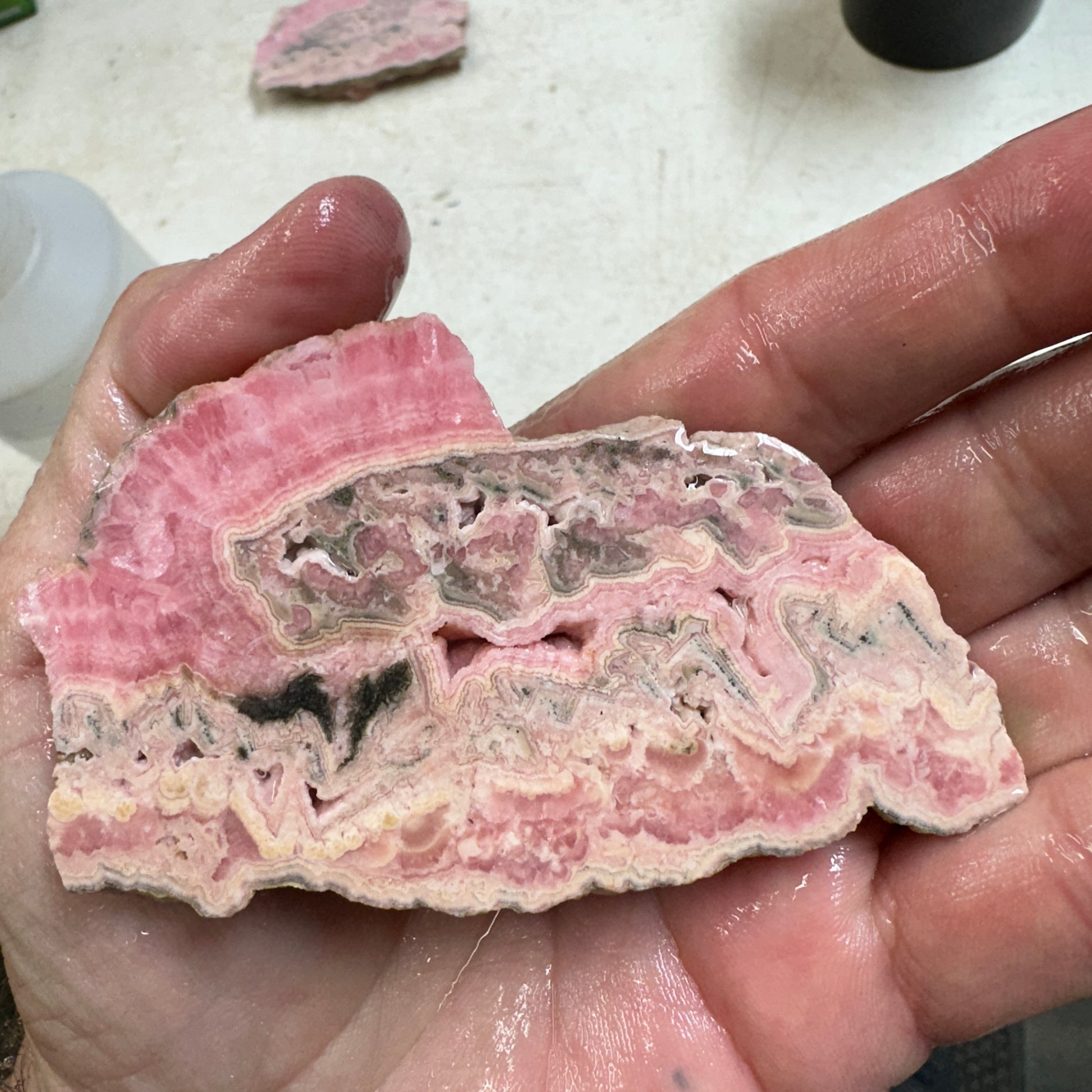 Old stock Rhodochrosite with a super cool, unique layout with geometric crystal pseudomorph patterns and pale to hot pink colors with a few small natural voids. The mine was bought and rhodochrosite does not get mined like it used to and is much harder to find these days. This slice will cut a few beautiful cabs!
