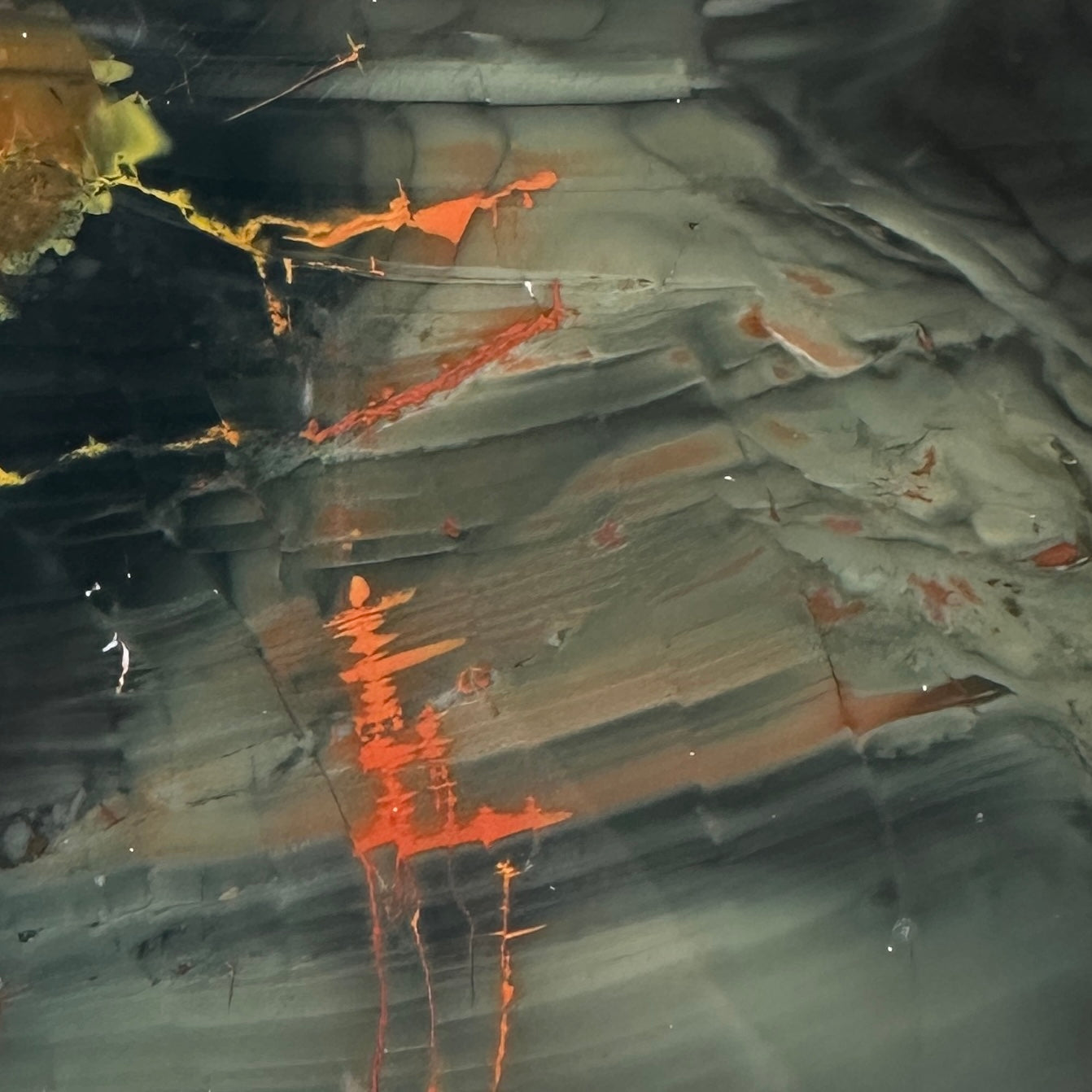 Stunning display slab with beautiful unique orange colors amongst the blues and greens, with overlapping orbs. Flat mirror polish.