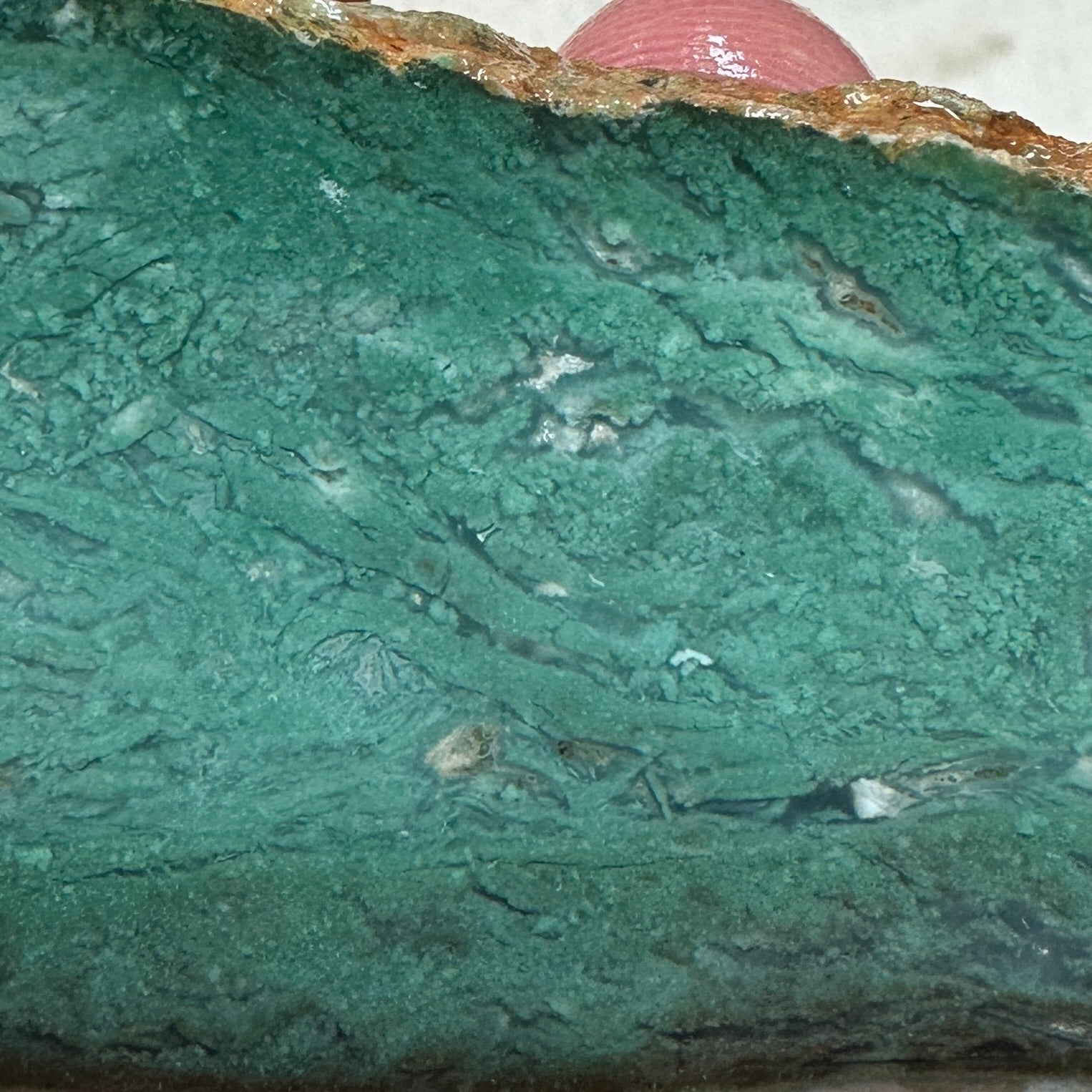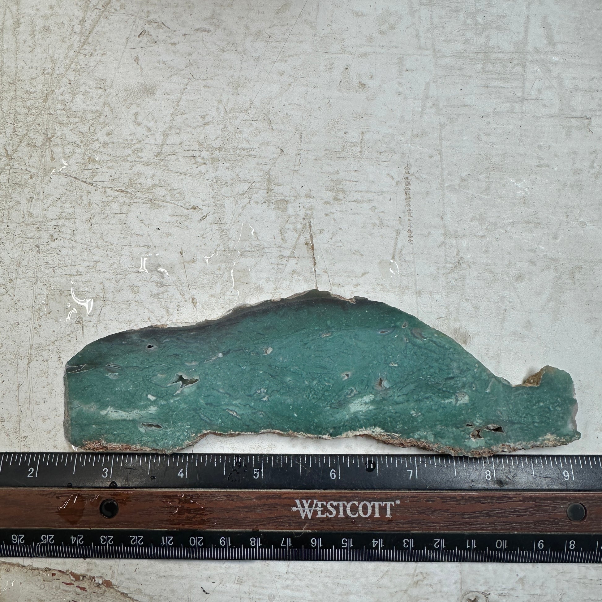 Beautiful Chrome Chalcedony aka Mtorolite with great color and fine patterns. There are some voids to note, as shown in the pics. But plenty of big smooth areas. This slice will cut a few beautiful cabs!