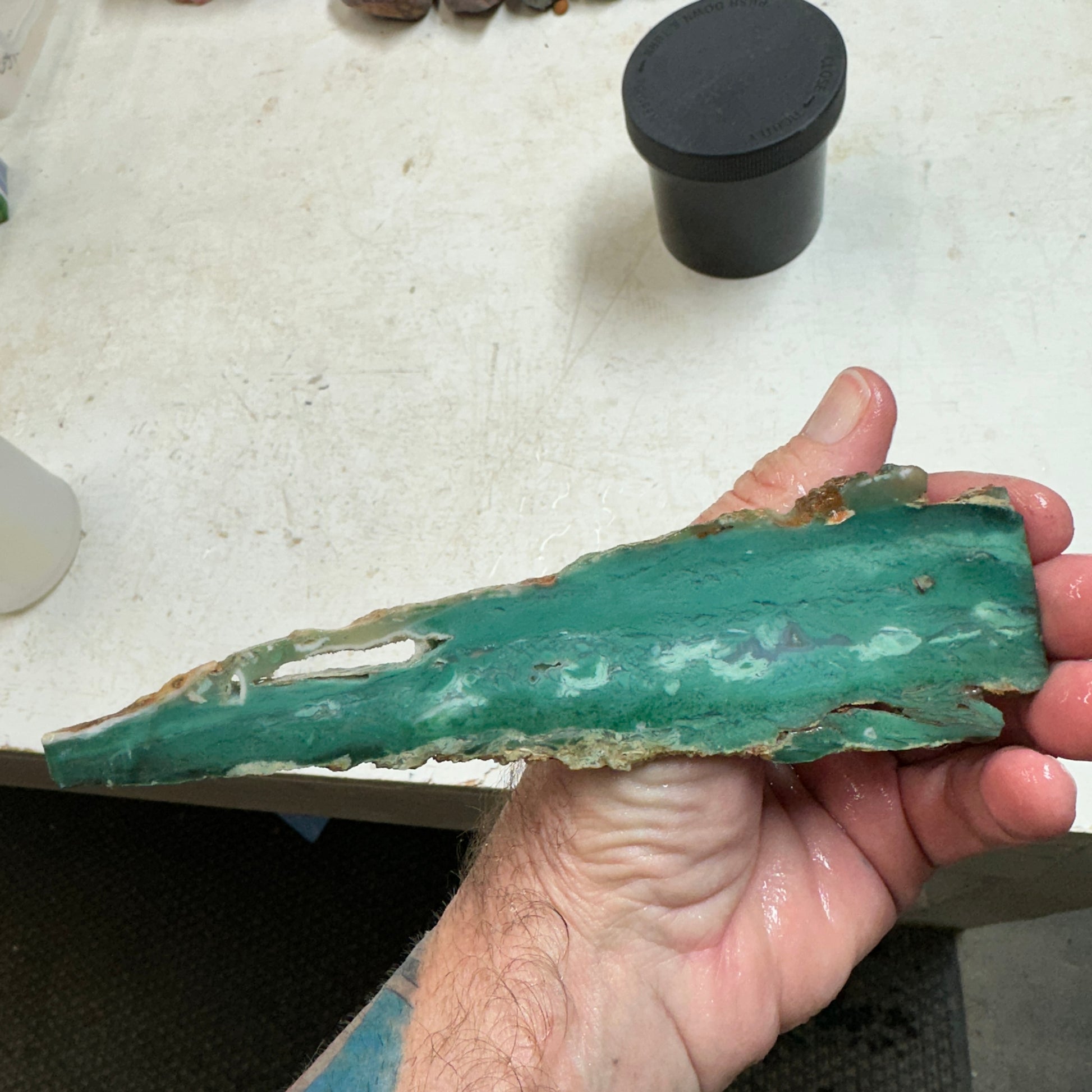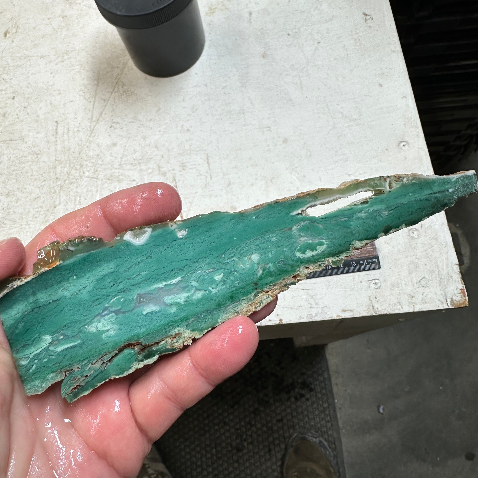 Beautiful Chrome Chalcedony aka Mtorolite with great color and fine patterns. There are some voids to note, as shown in the pics. But plenty of big smooth areas. This slice will cut a few beautiful cabs!