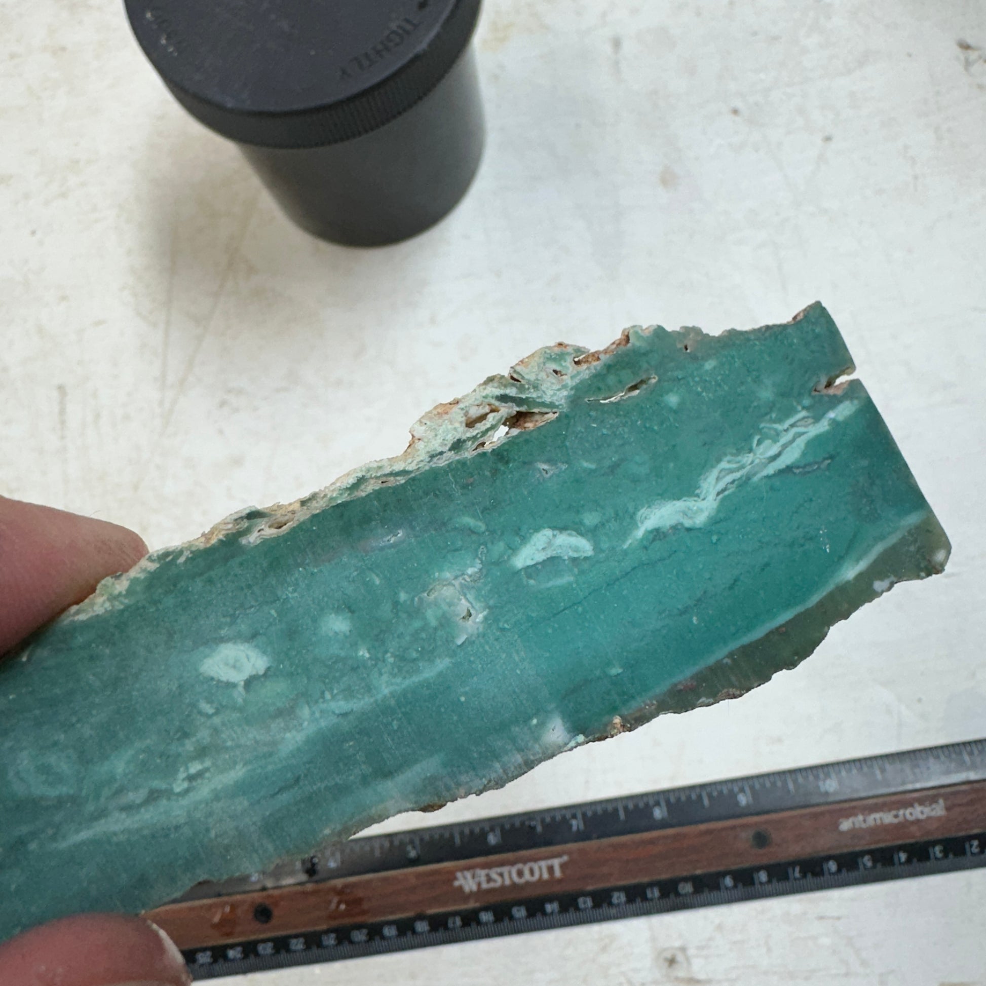 Beautiful Chrome Chalcedony aka Mtorolite with great color and fine patterns. There are some voids to note, as shown in the pics. But plenty of big smooth areas. This slice will cut a few beautiful cabs!