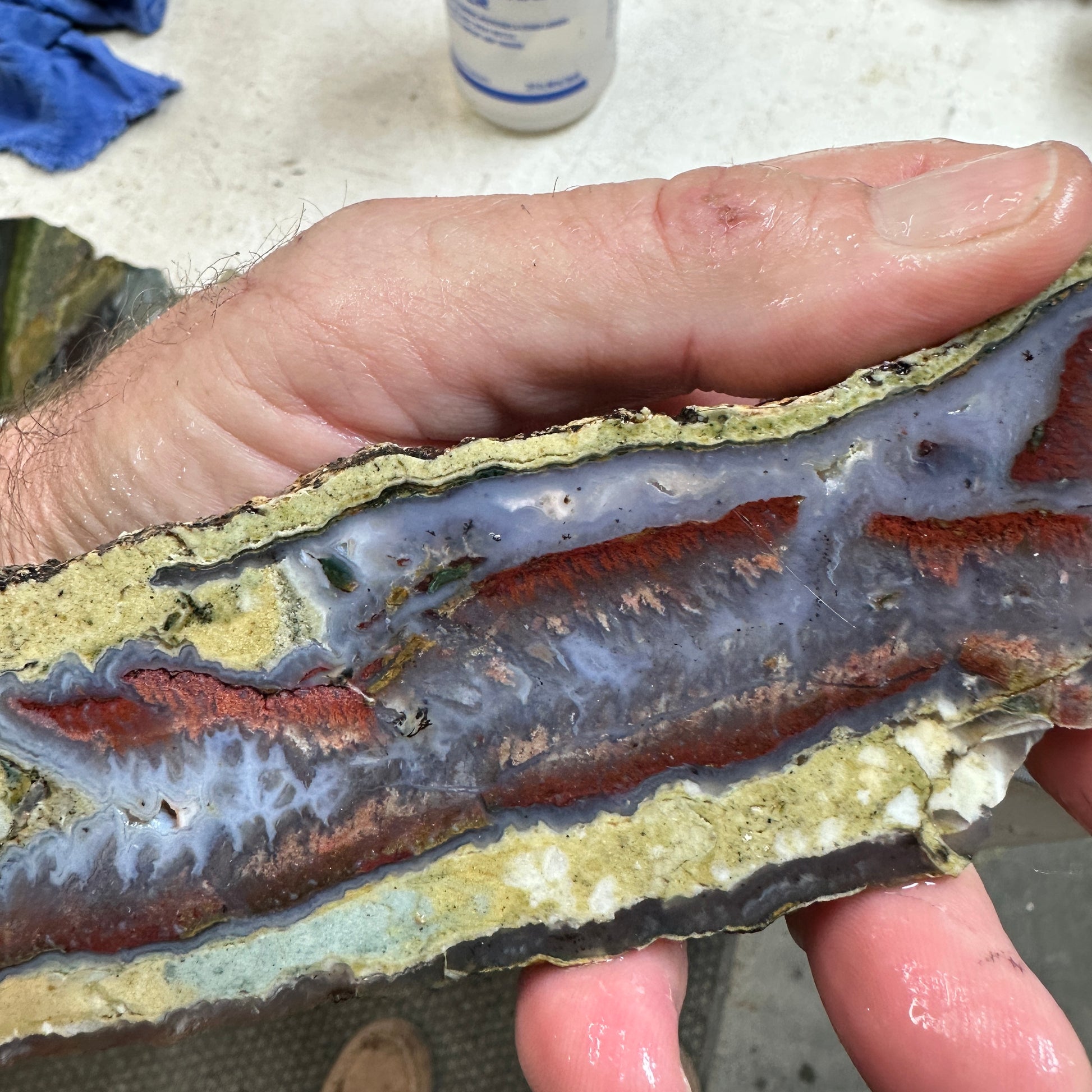 Excellent slice of a new find: Echo Ridge Jasper and Agate(This is the plume agate). Beautiful plumes in blood red to pink colors that will produce unique cabs or make an awesome rare collection slice! Mostly smooth(Some vuggy areas): excellent quality for cutting.