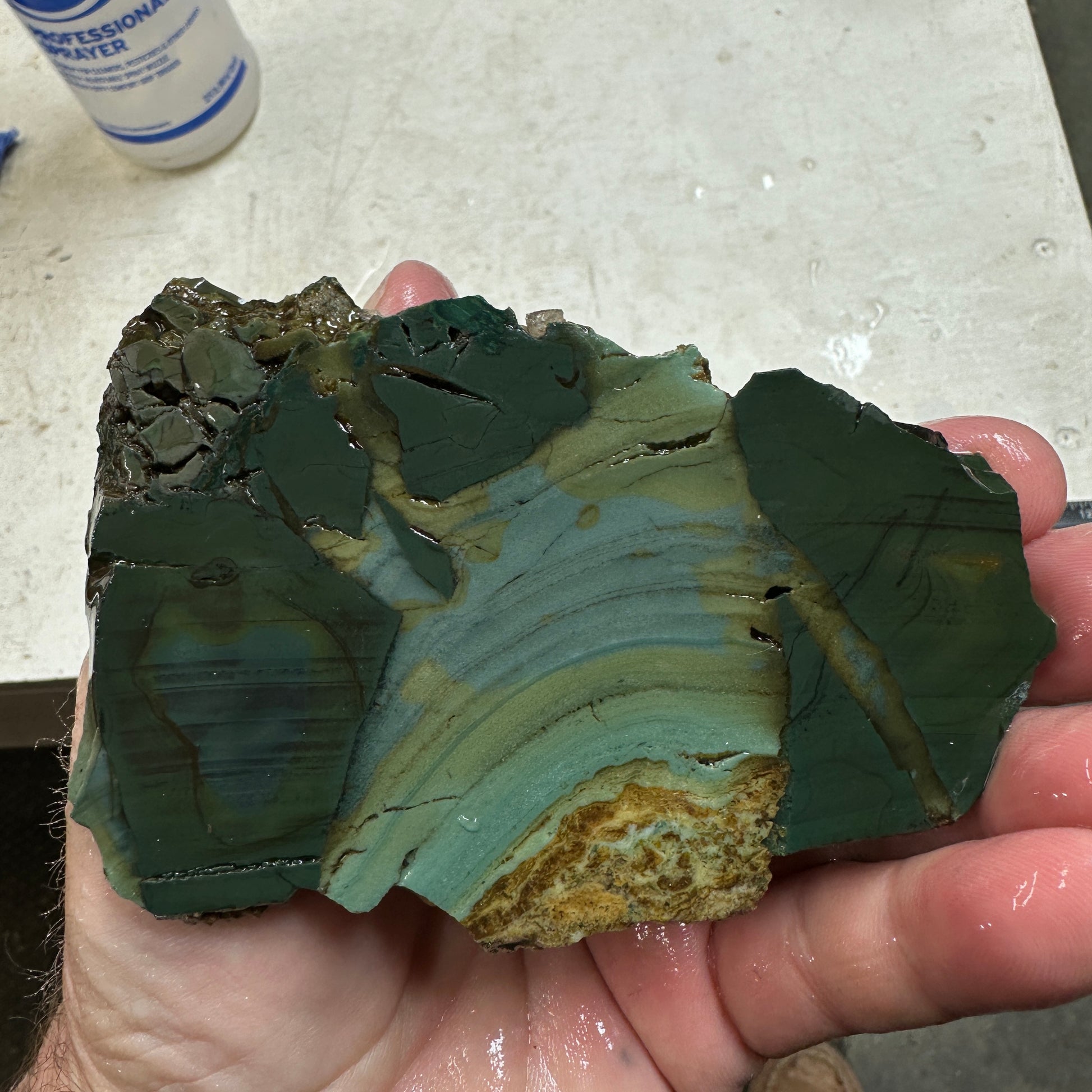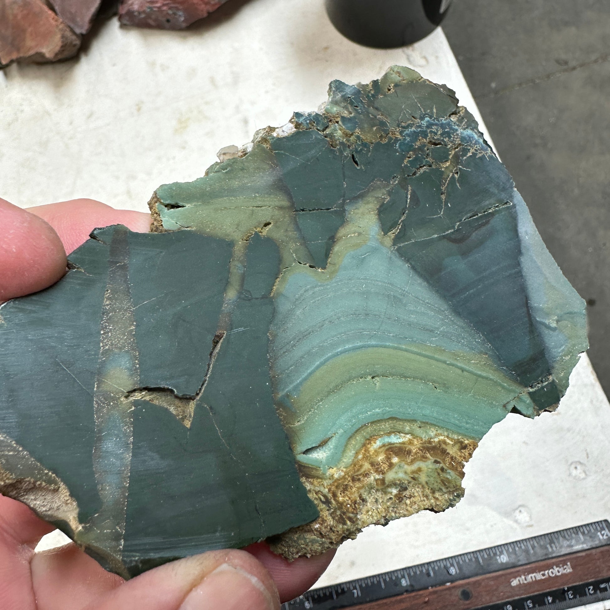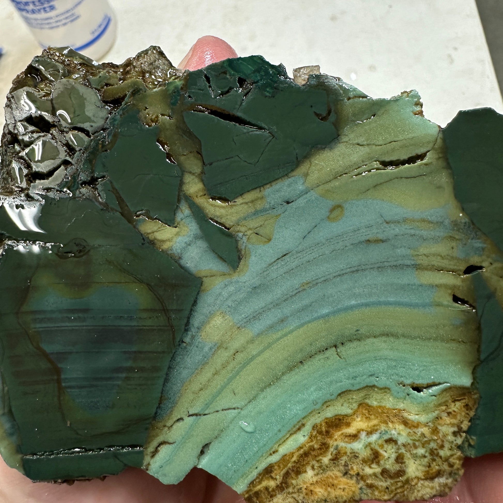 Excellent slice of a new find: Echo Ridge Jasper and Agate(This is the jasper). Beautiful unique scenic patterns in the greens, with blue green layered patterns cutting through that will produce unique cabs! Mostly smooth(there are fissures to work around or fill, as shown): excellent quality for cutting.