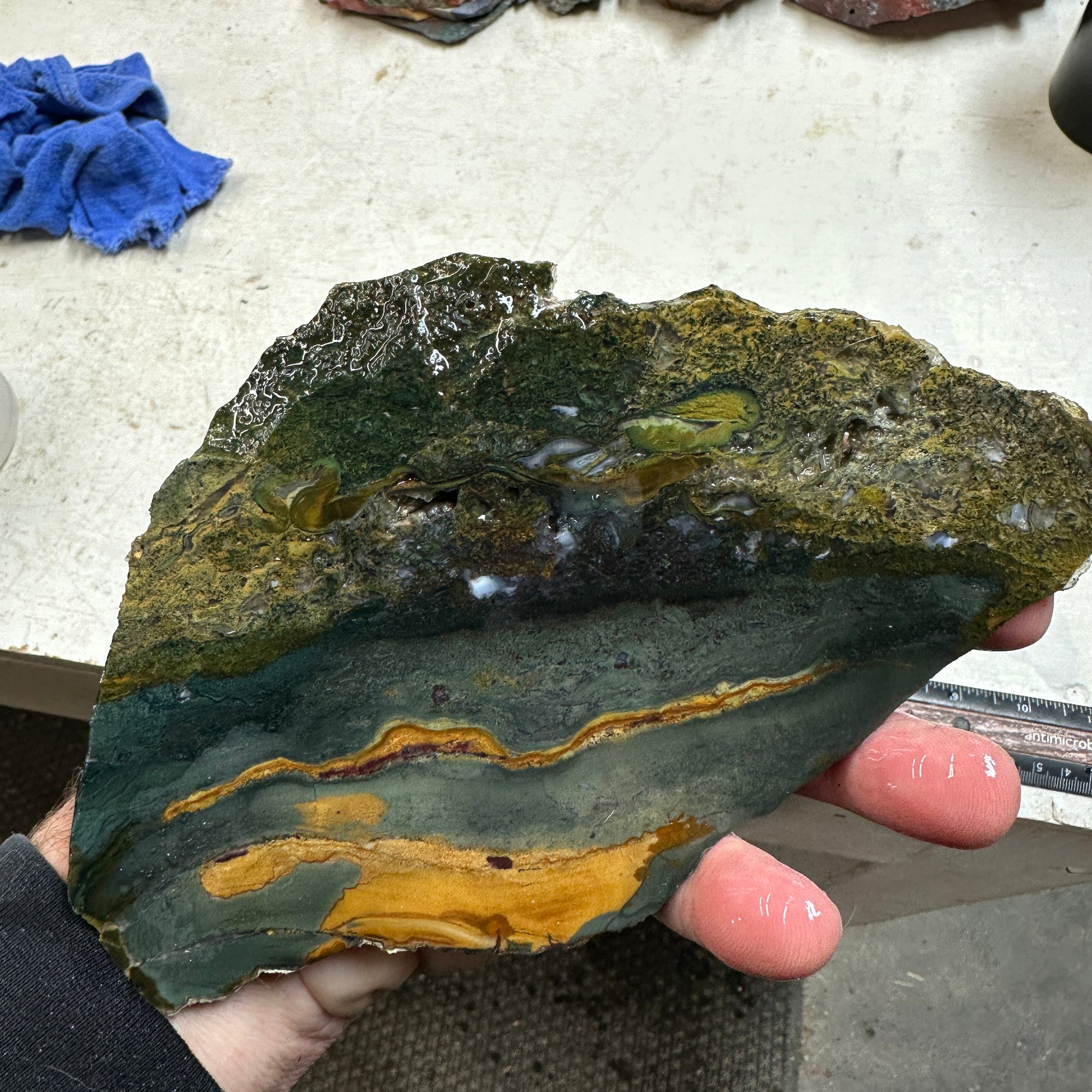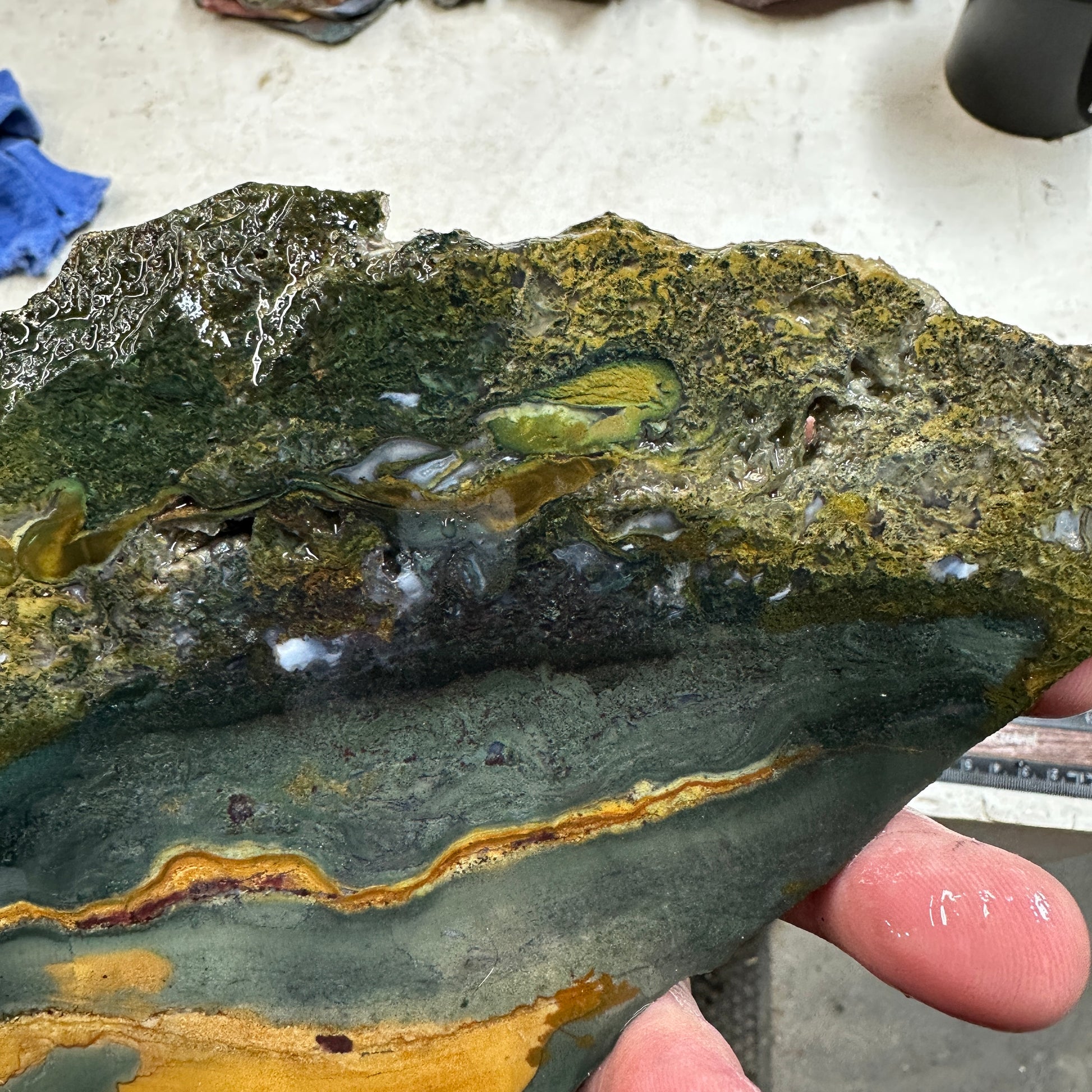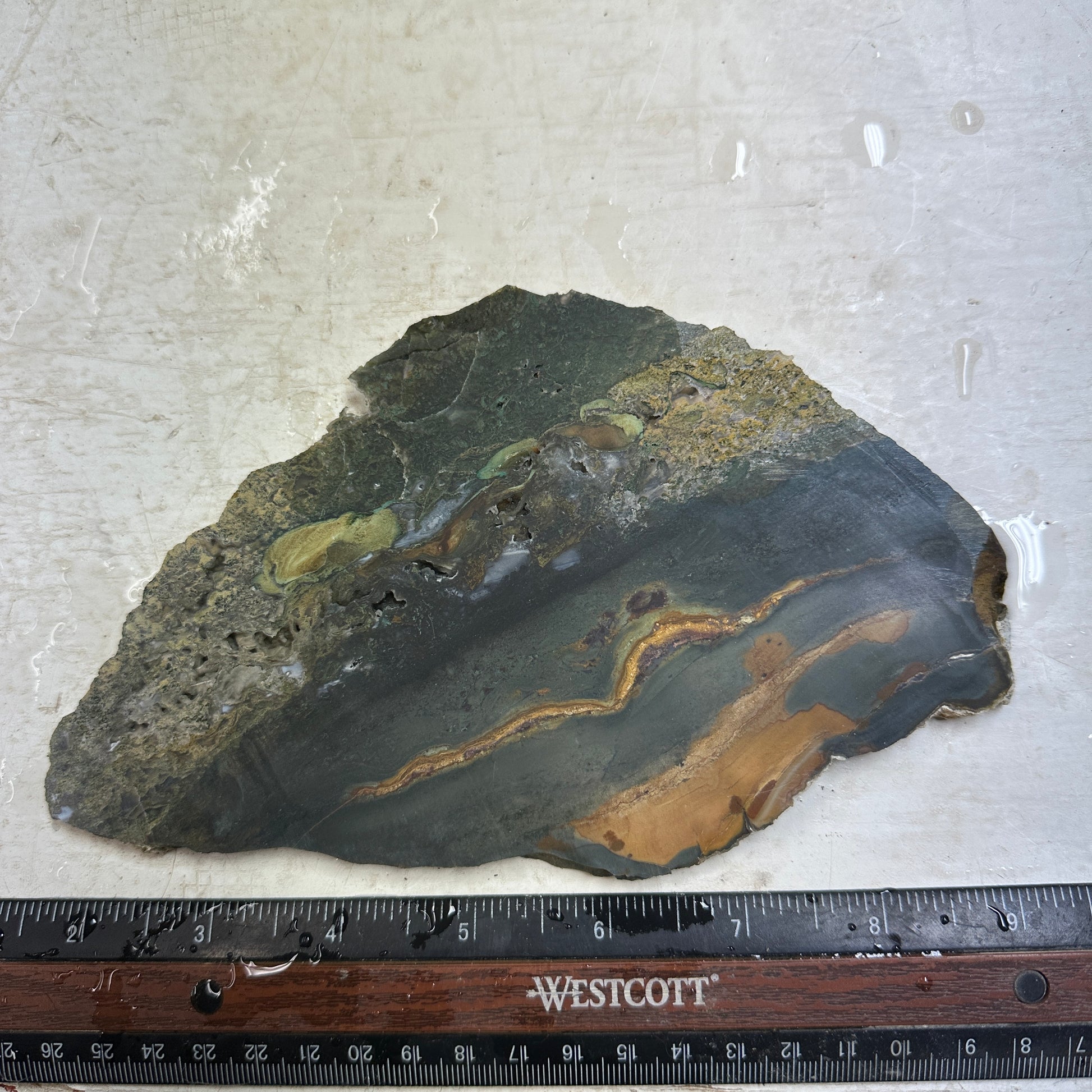 Excellent slice of a new find: Echo Ridge Jasper and Agate(This is the jasper). Beautiful scenic patterns in jasper bottom, with unique deep features with lots of cool pockets that will produce unique cabs! Mostly smooth(a few small cracks just at one edge corner in the mossy area): excellent quality for cutting.