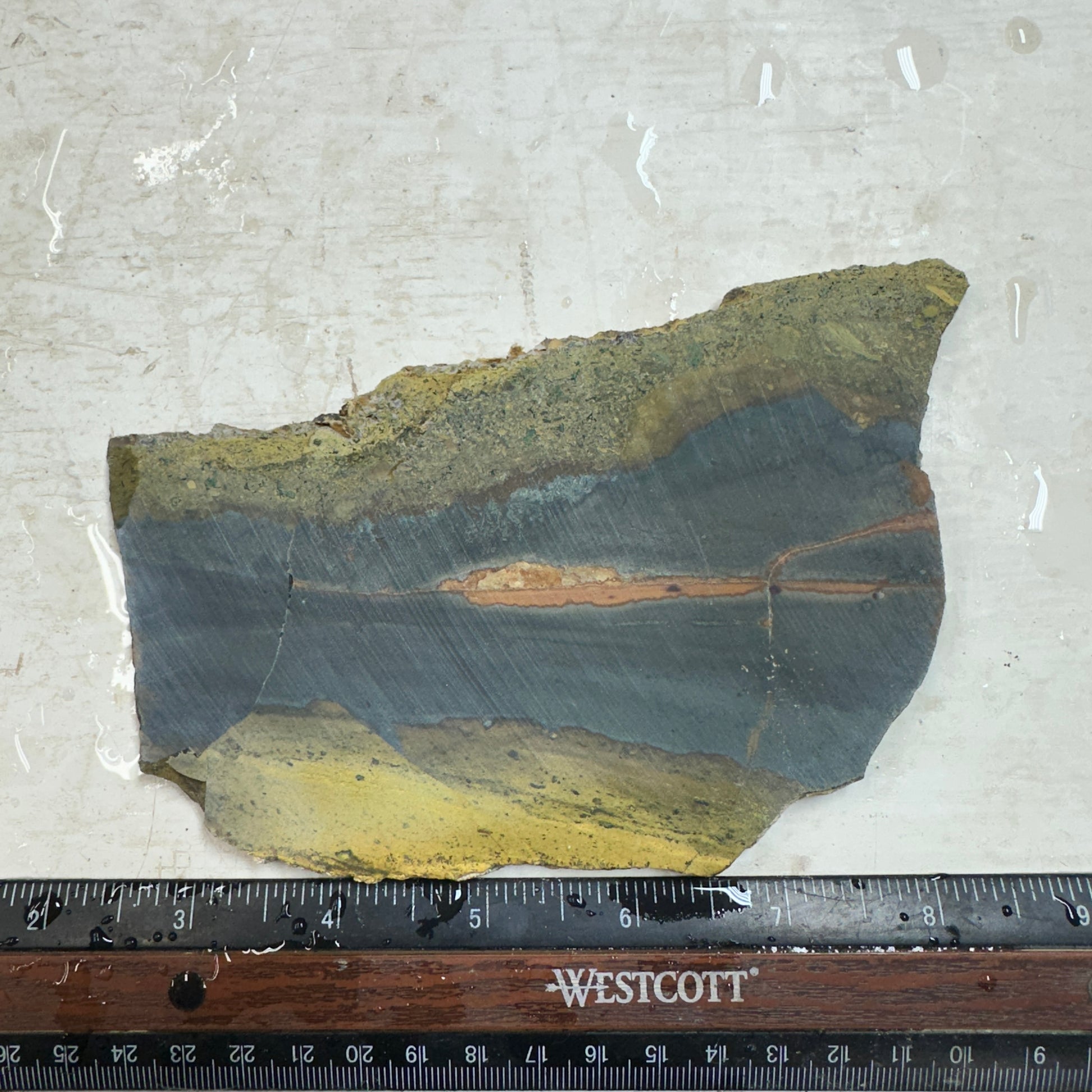 Excellent slice of a new find: Echo Ridge Jasper and Agate(This is the jasper). Beautiful scenic patterns top and bottom with unique blue green violet gold colors that will produce unique cabs! Mostly smooth(the gold streak in the center has a hairline running up it): excellent quality for cutting.