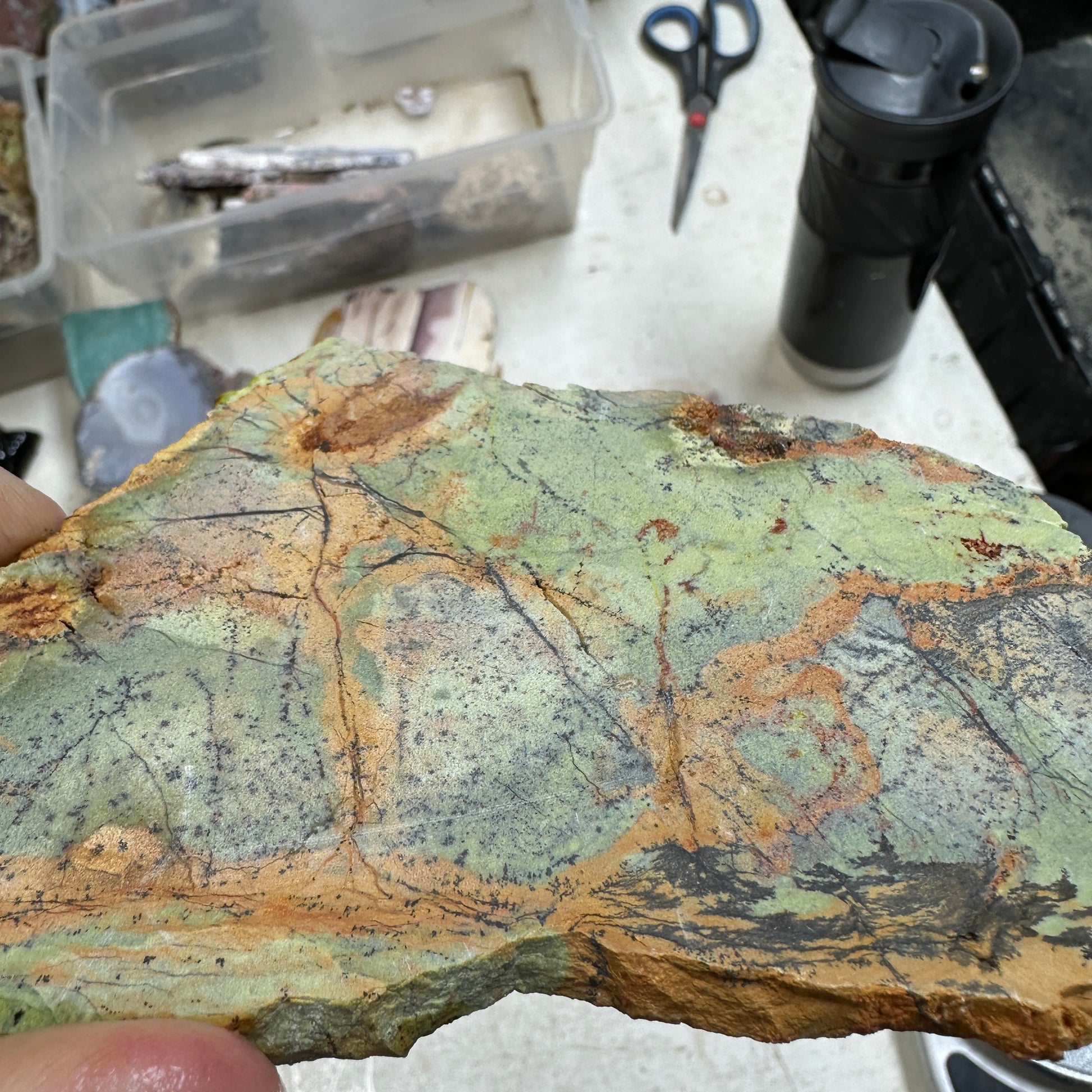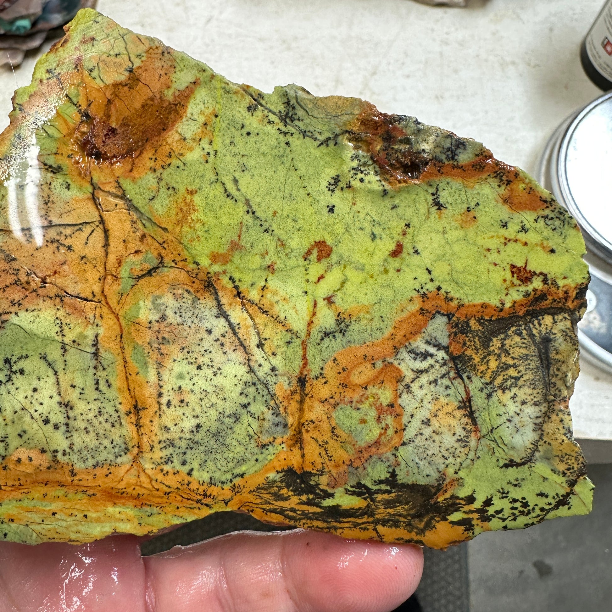 Excellent slice of rare Green Dream a Gaspeite type rock we dig in Nevada!!! Cuts and polishes beautifully. There are some rotted out voids in a few area, I displayed in an extra dry picture. Lots of room to work still. Higher grade deep green from the gully spot where the best came from!