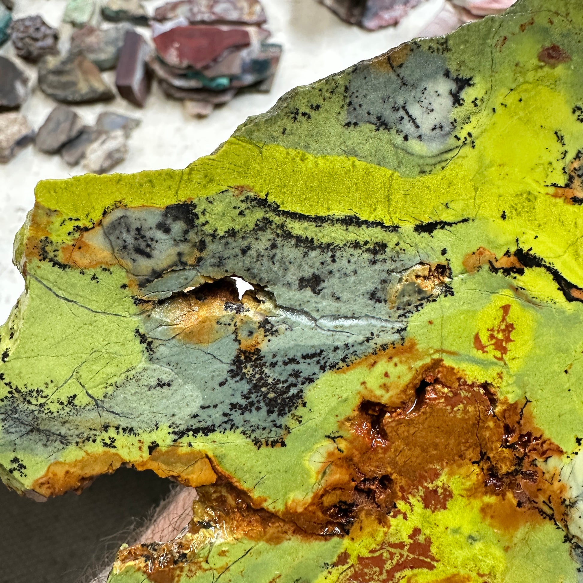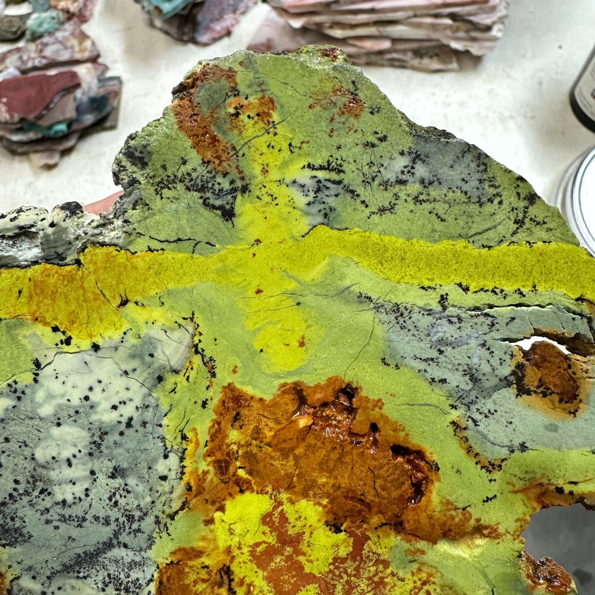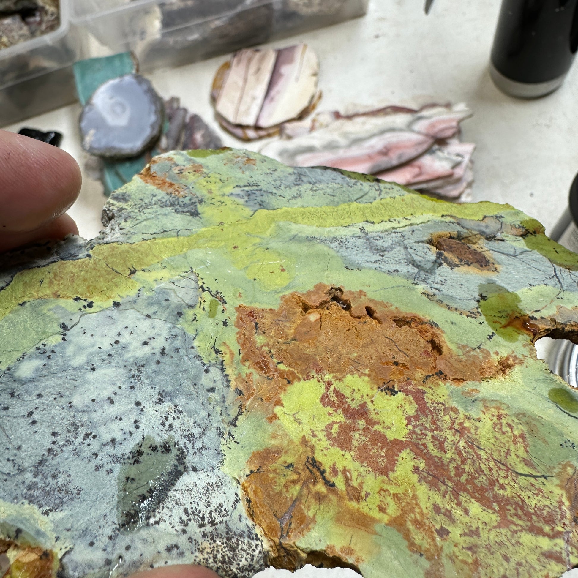 Excellent slice of rare Green Dream a Gaspeite type rock we dig in Nevada!!! Cuts and polishes beautifully. There are some rotted out voids in a few area, I displayed in an extra dry picture. Lots of room to work still. Higher grade deep green from the gully spot where the best came from!