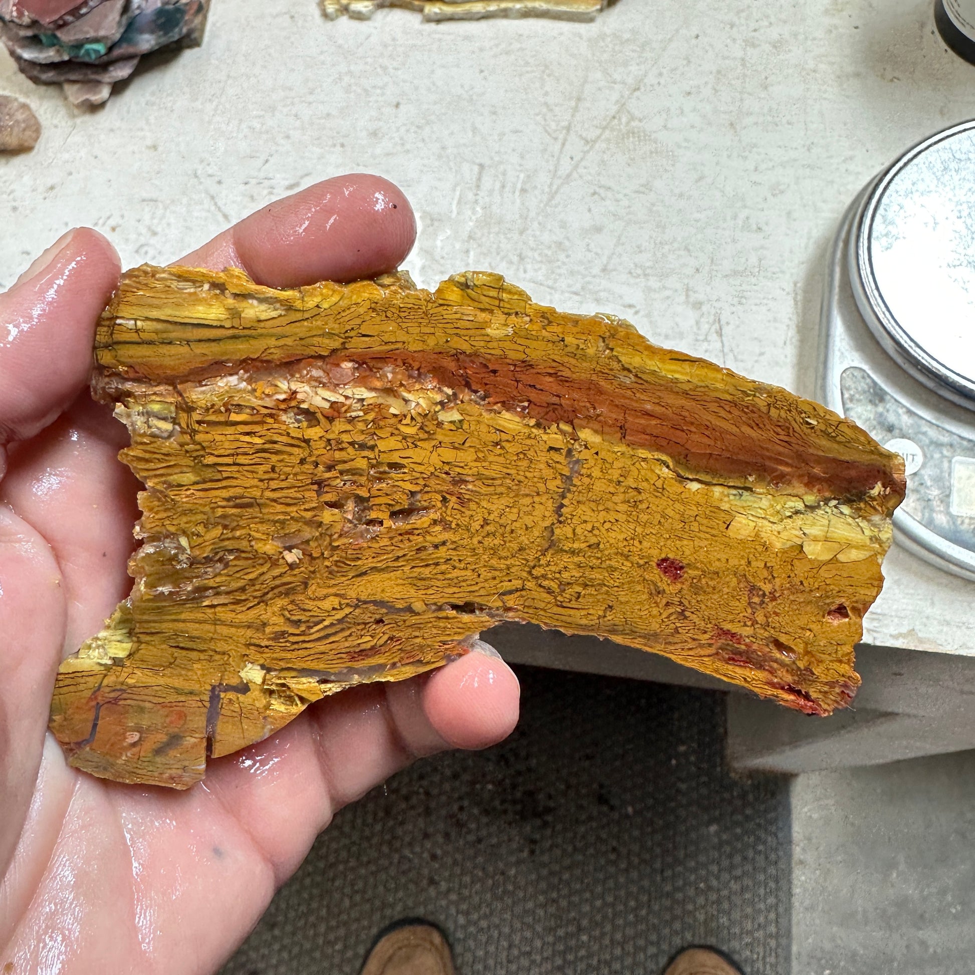 Excellent slice of agatized rathar than opalized Howardite with a unique play of colors and strippled top to bottom with loads of character! Smooth with lots of small voids as usual: excellent quality for cutting in the clean areas.
