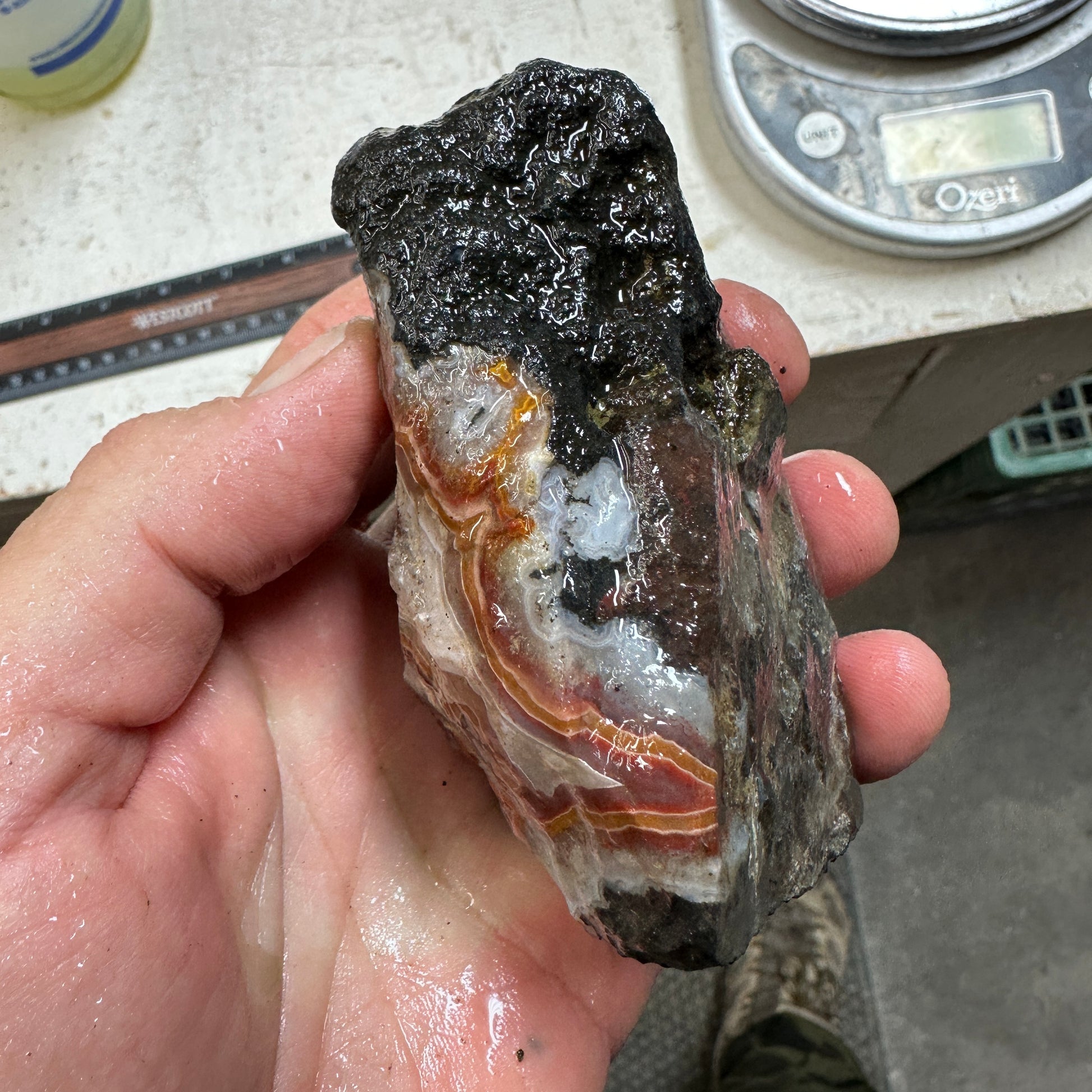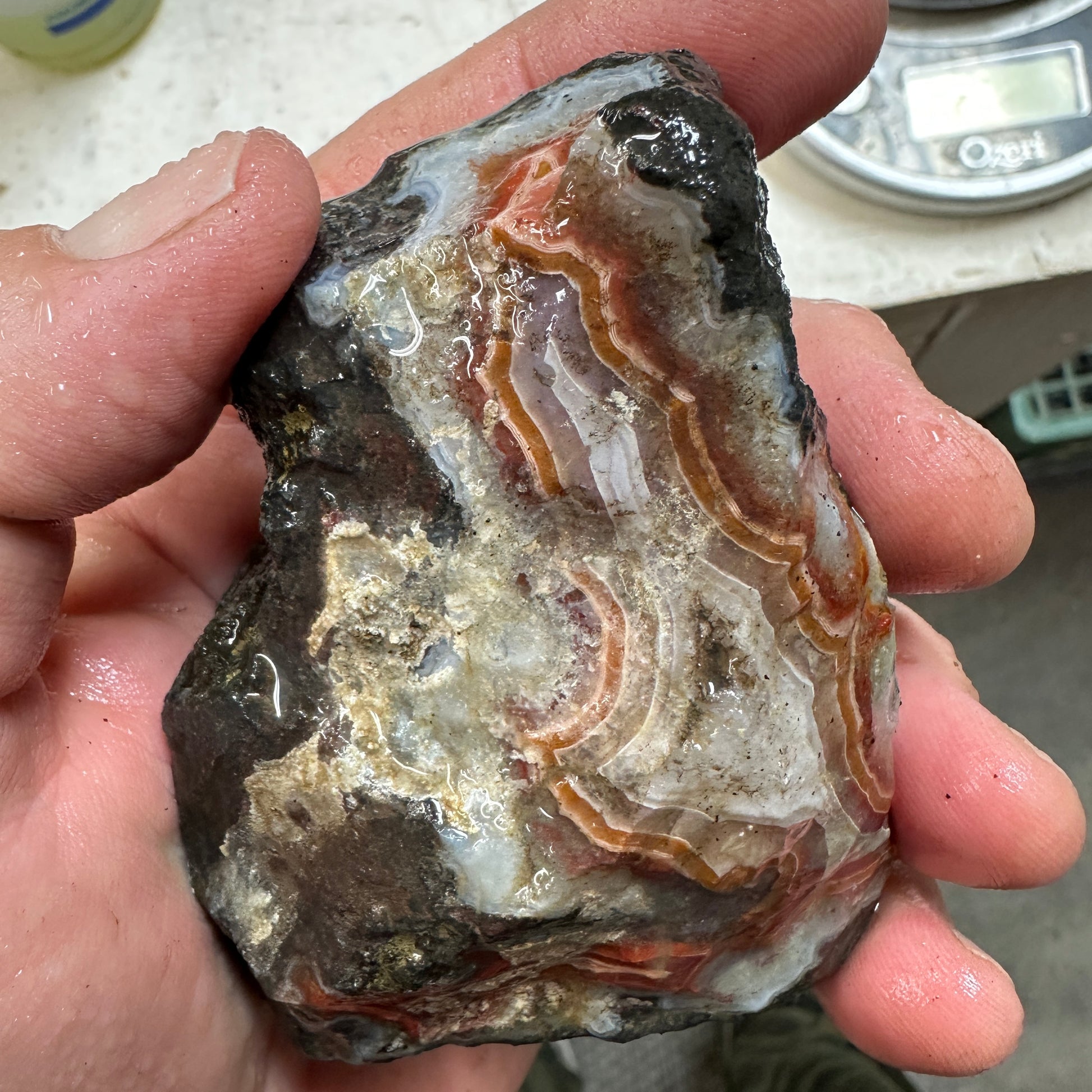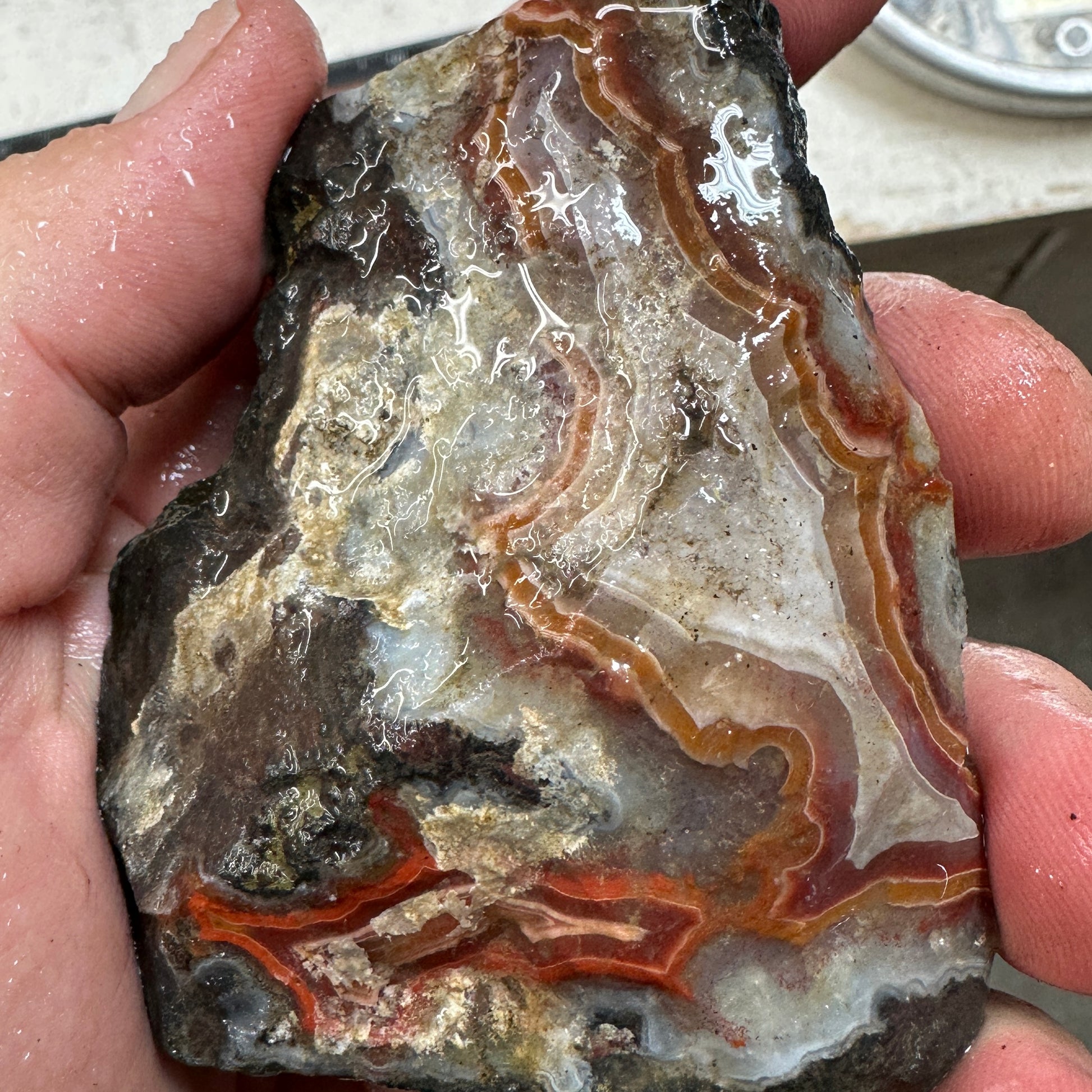 Nice seldom seen cutter chunk of Bou Hamza Agate with bright fortifications in black agate. Excellent quality for cutting.