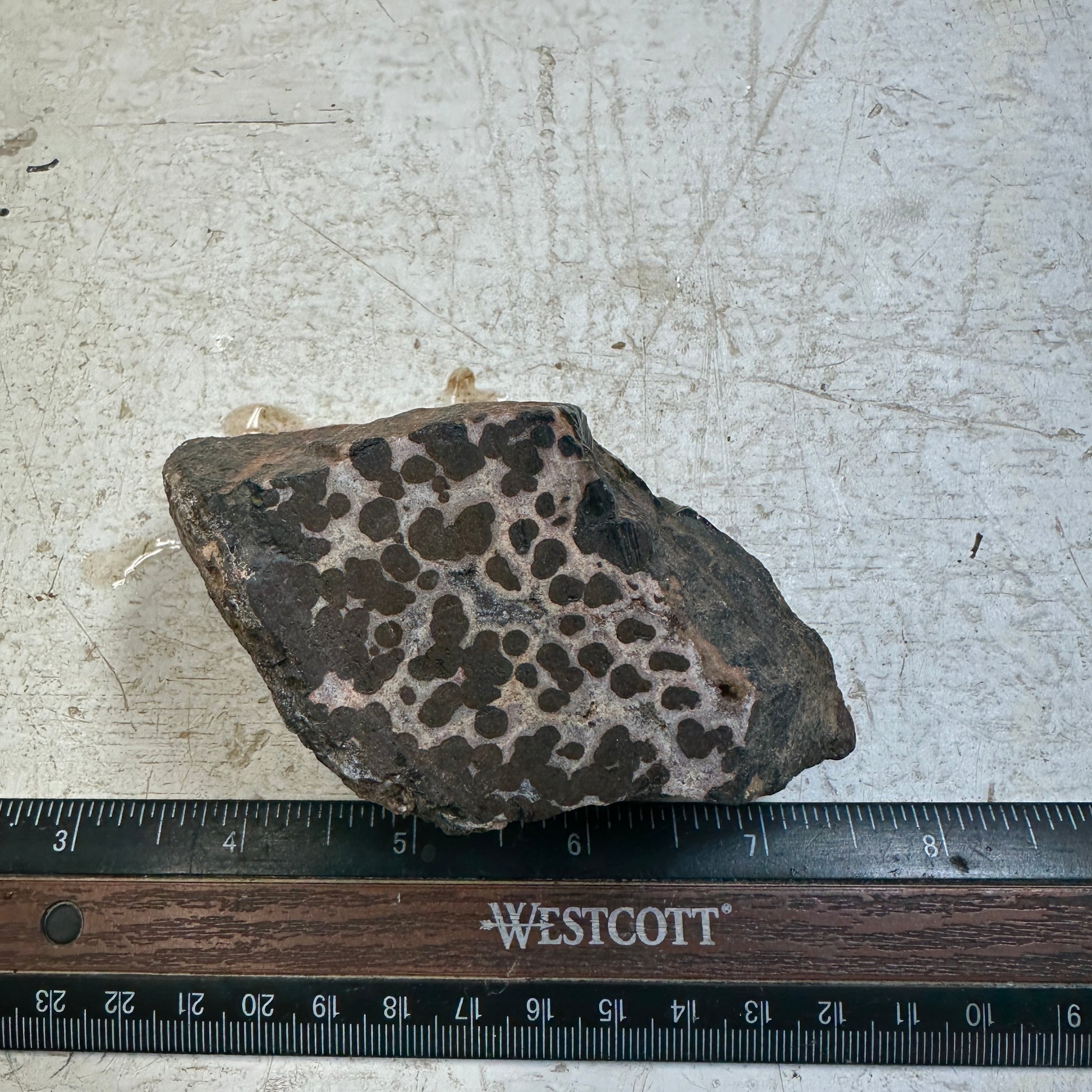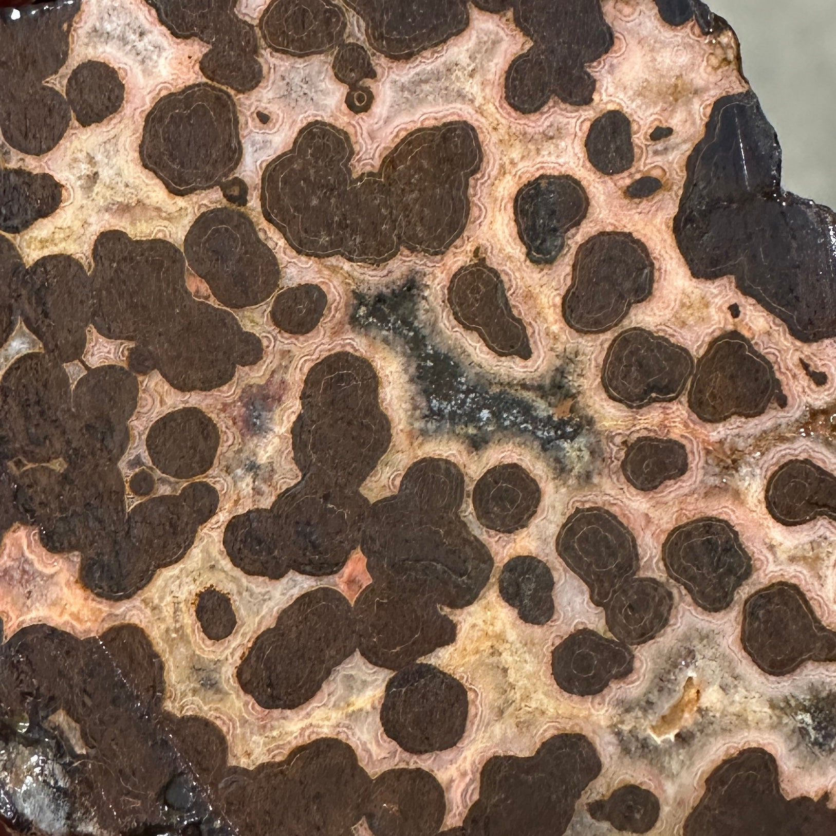 A truly unusual example of Seam Agate with orbs and metallics! Excellent quality, very solid for cutting cabs!!!