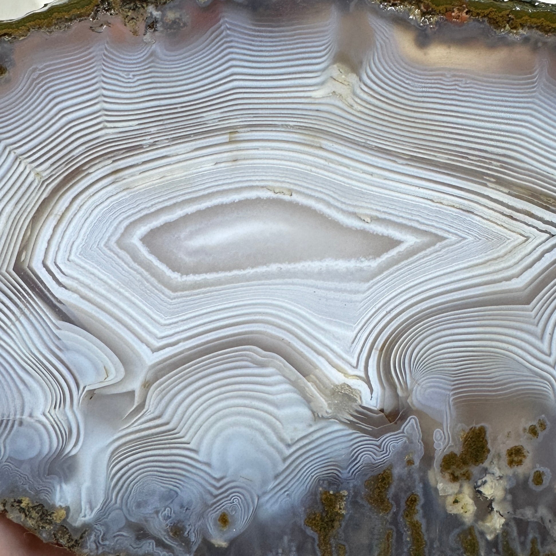 Smooth slice of a Kerrouchen Agate with fine banding and parallax(shadow)! These white banded agates cut extremely good cabs in the right artist hands. Excellent quality for cutting.