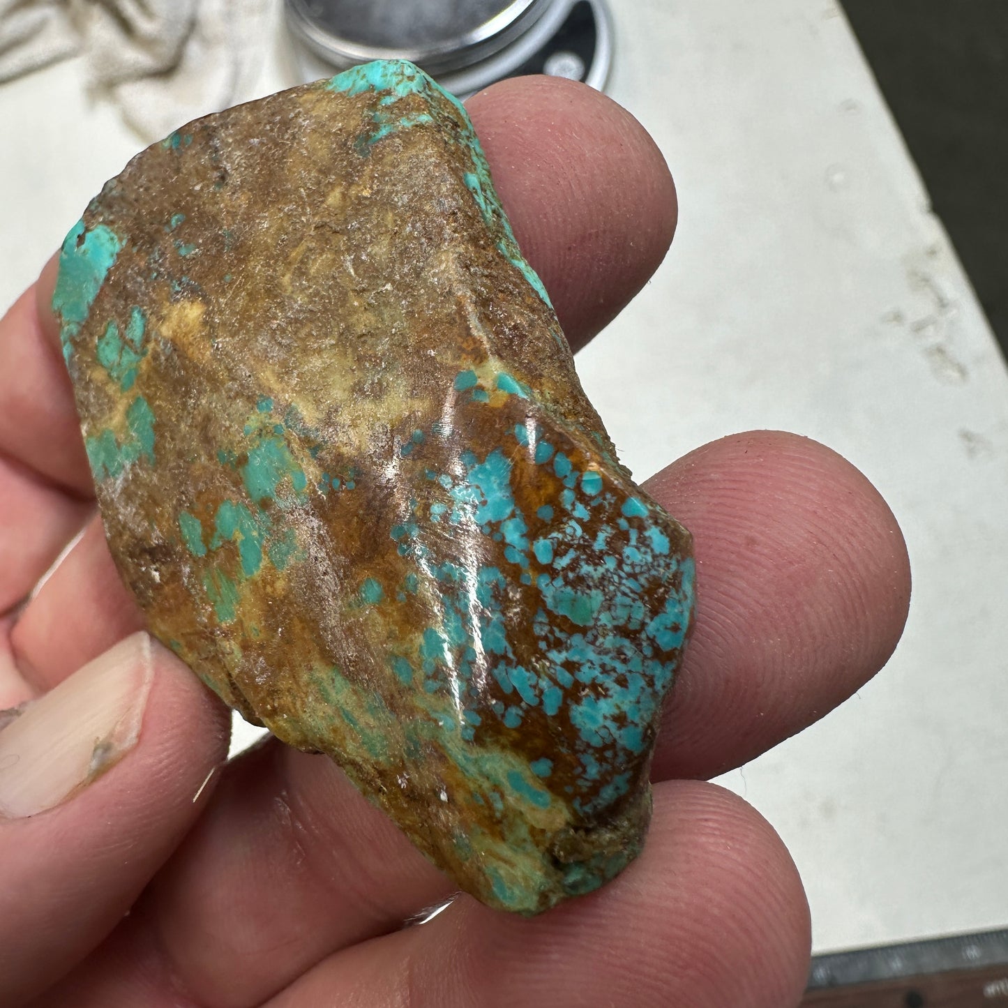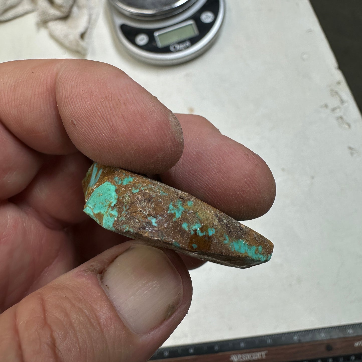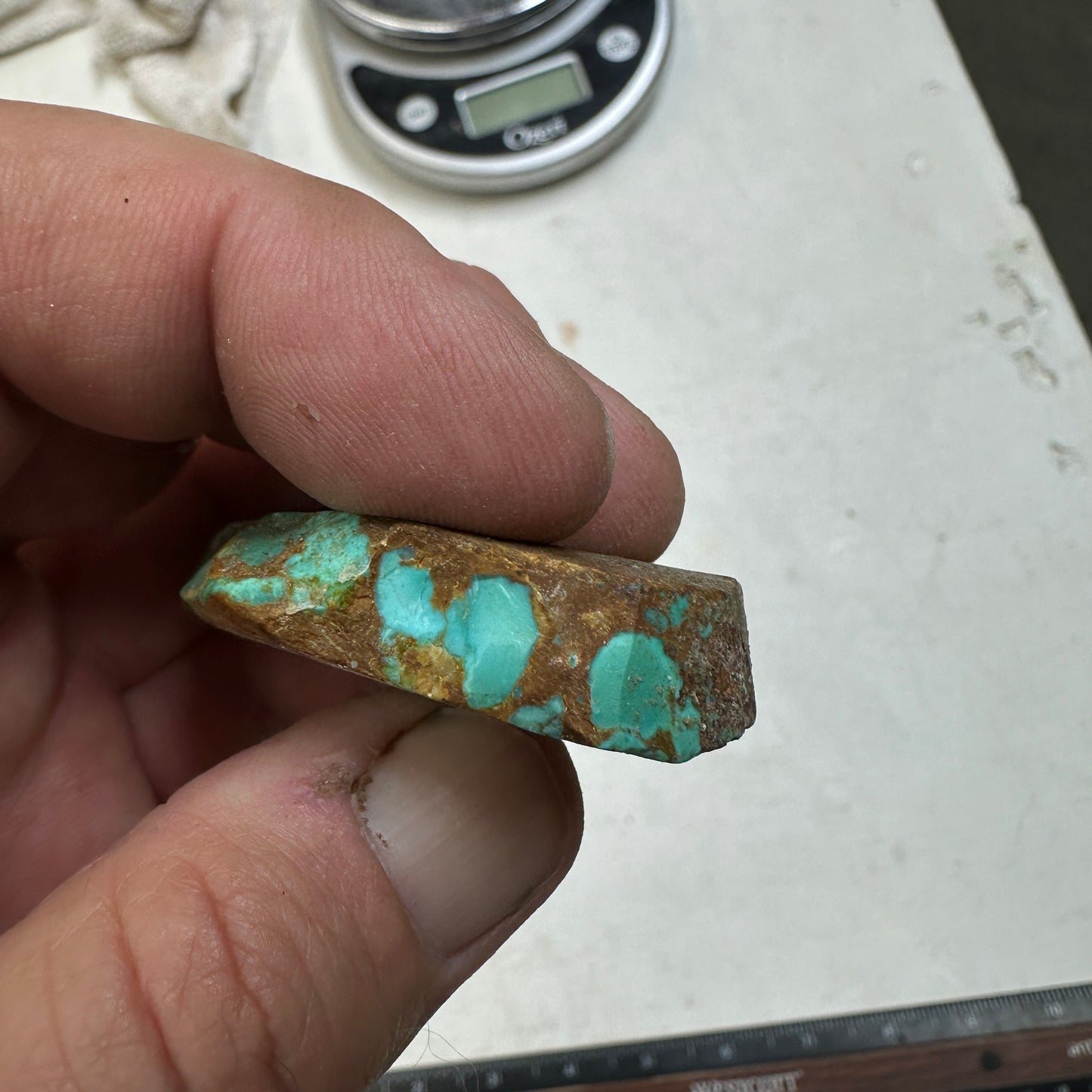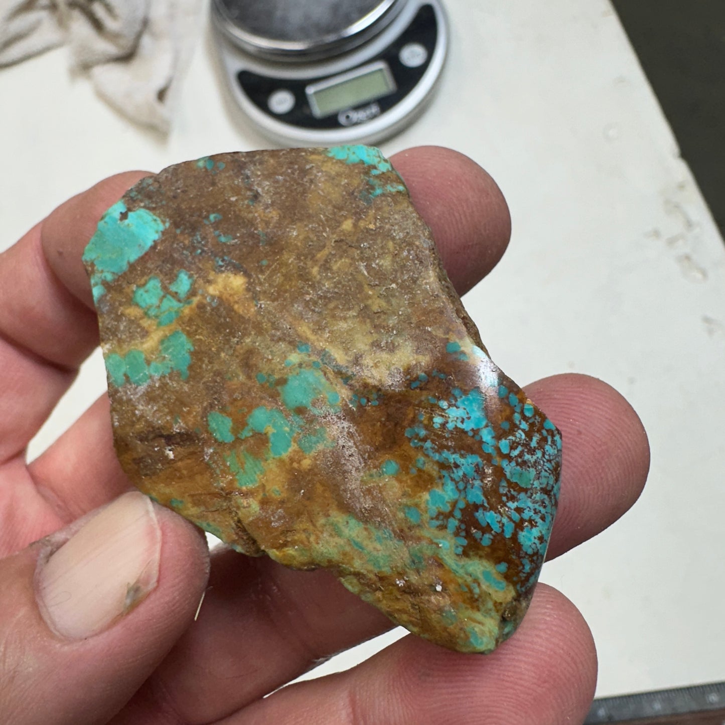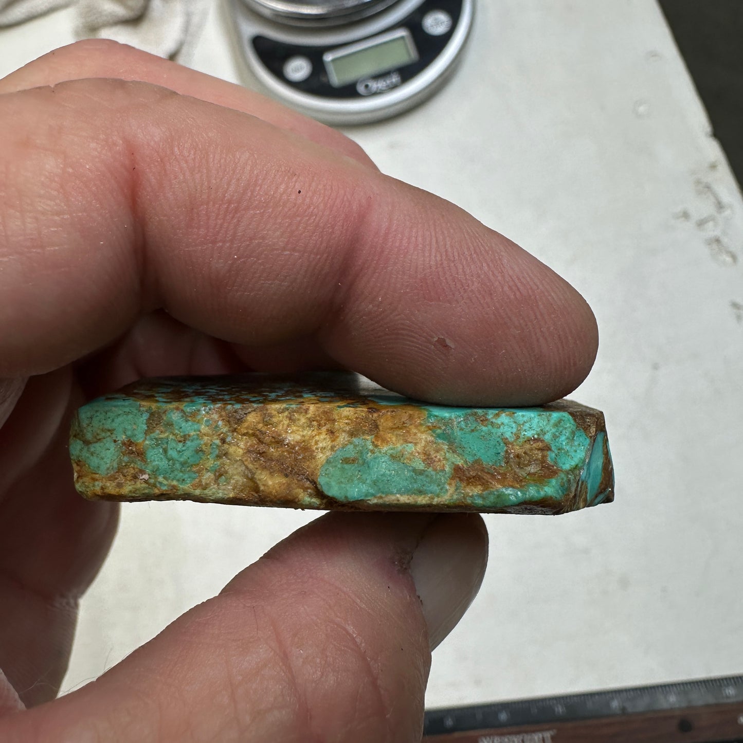 52 gram trimmed windowed plate of stabilized Rising Phoenix Turquoise from the Kingman Mine in Arizona. Very hard, it cuts well, taking a good polish. Excellent turquoise with earth tones that cuts truly beautifully.
