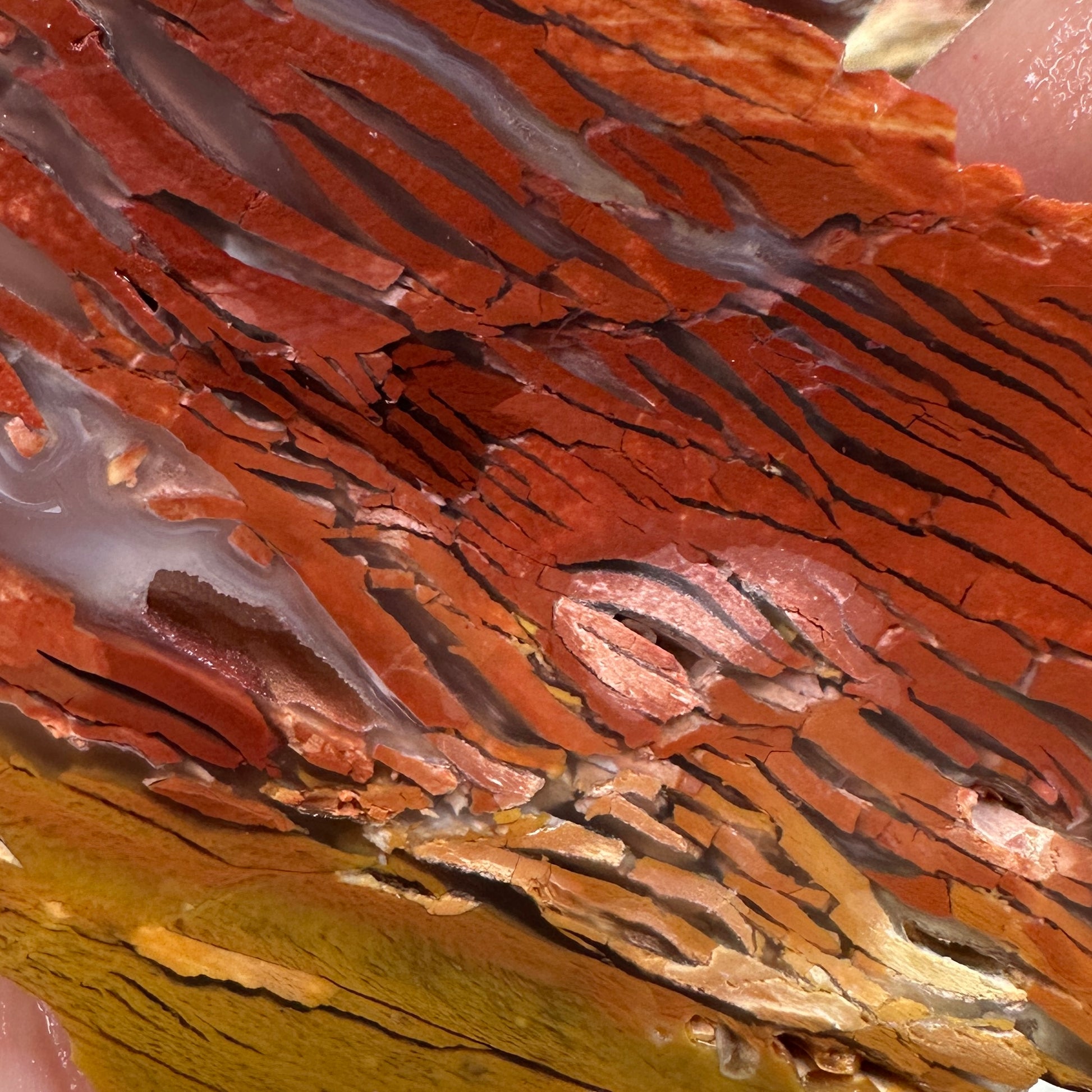 Excellent slice of Sunset Howardite with a unique play of colors and strippled top to bottom with loads of translucency! Smooth with a voids as usual but not much: excellent quality for cutting.