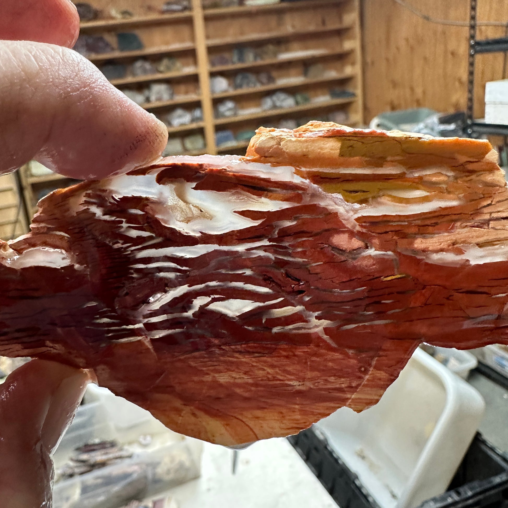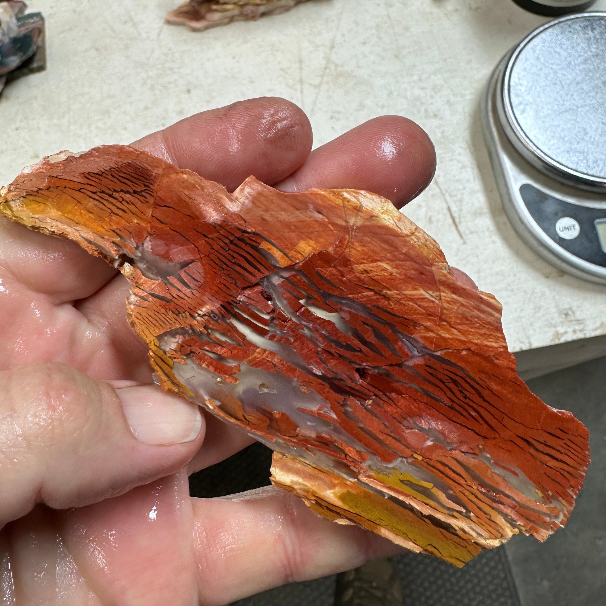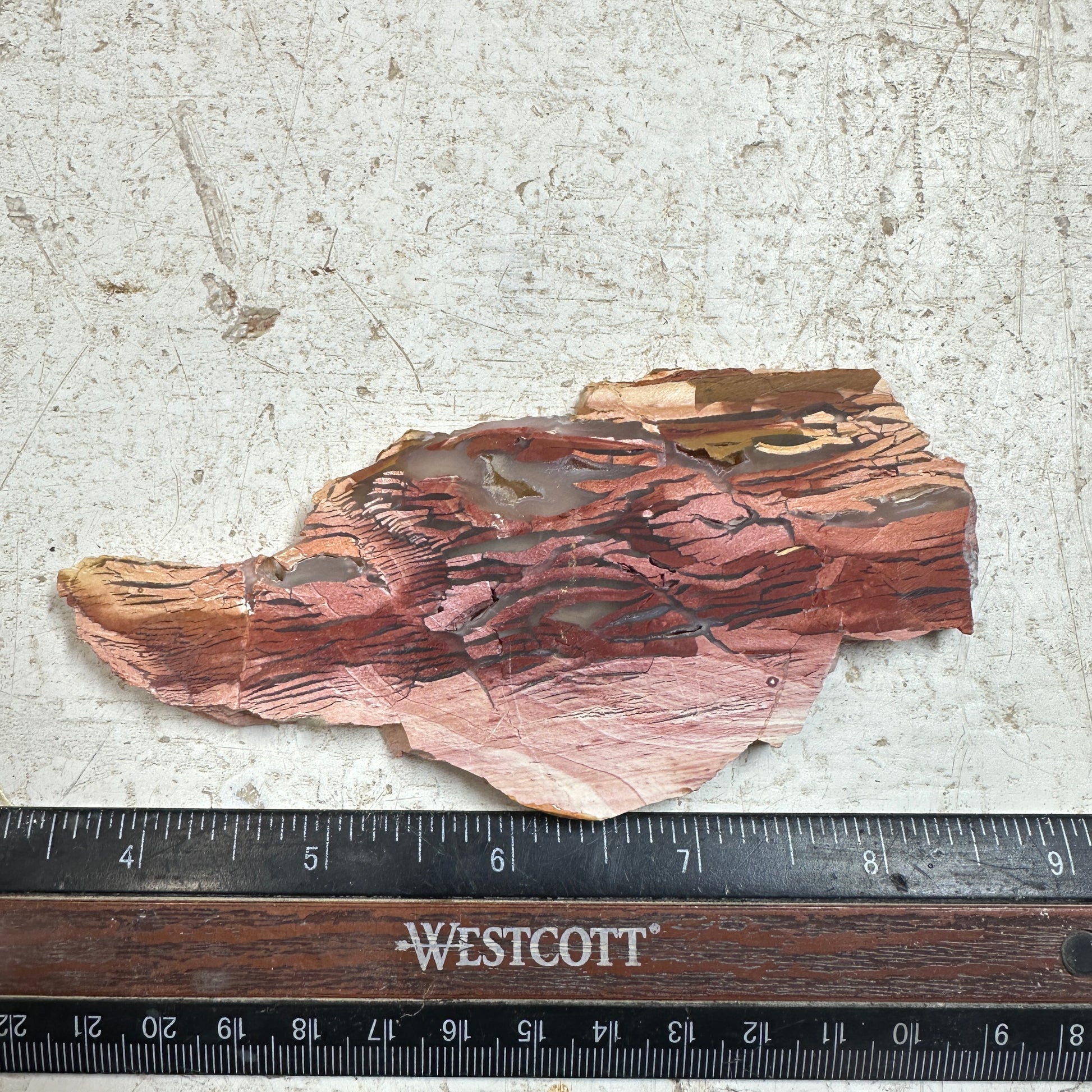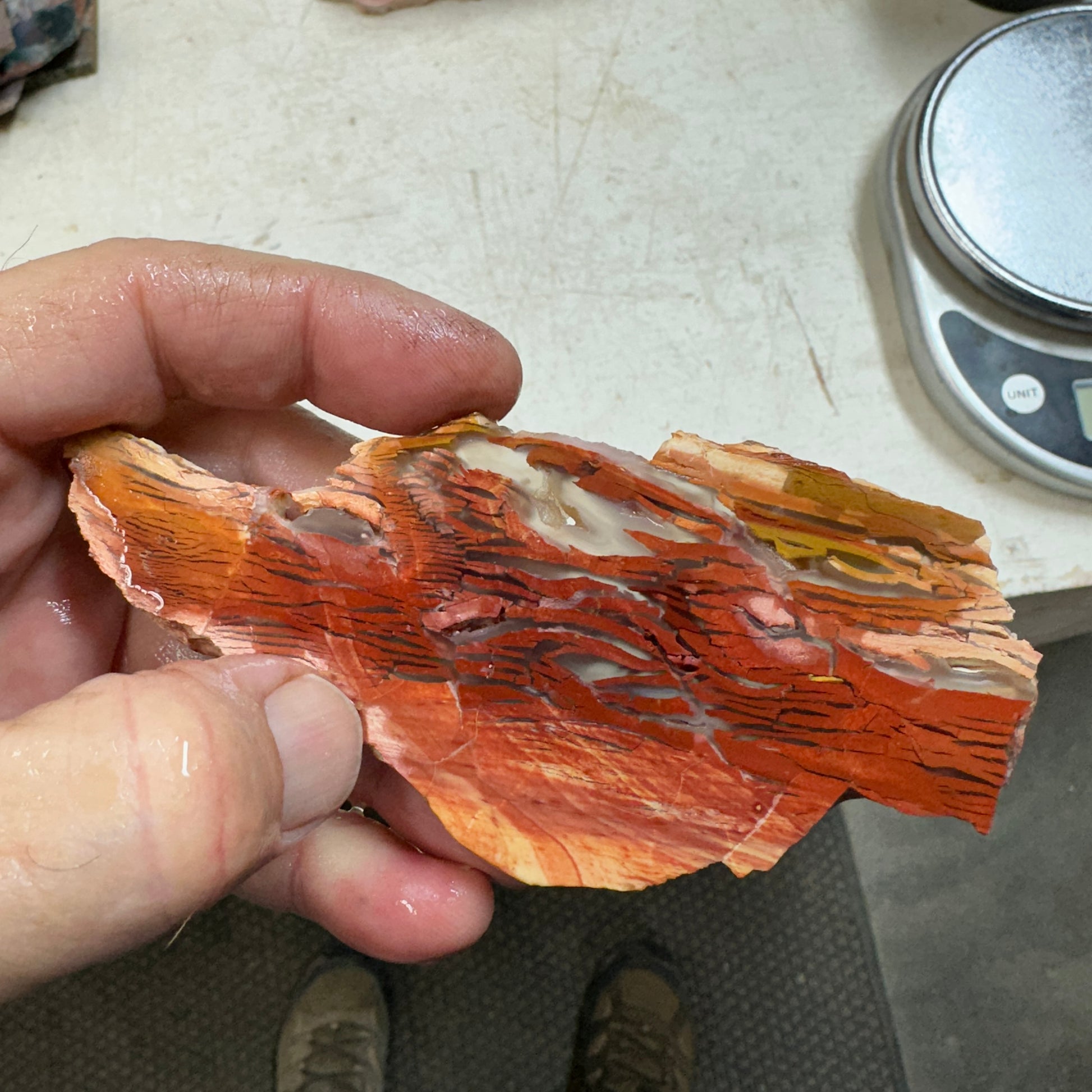 Excellent slice of Sunset Howardite with a unique play of colors and strippled top to bottom with loads of translucency! Smooth with a voids as usual but not much: excellent quality for cutting.
