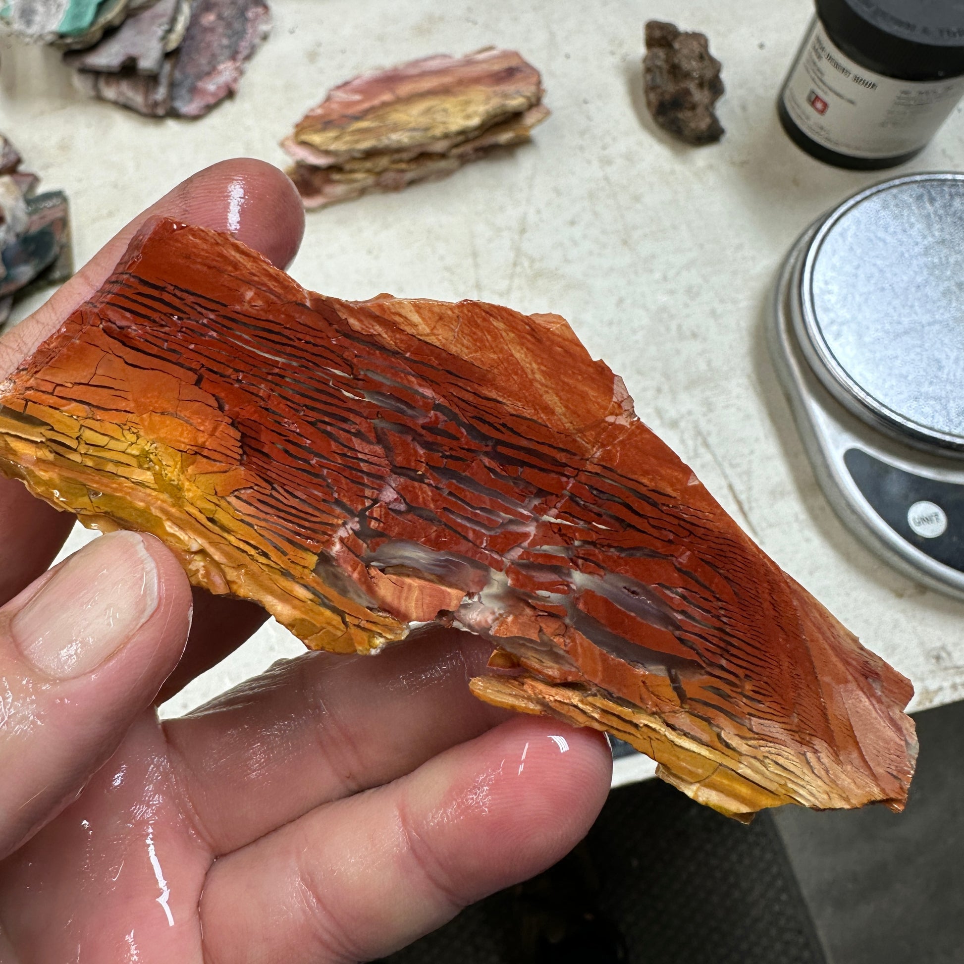 Excellent slice of Sunset Howardite with a unique play of colors and strippled top to bottom with loads of translucency! Smooth with a voids as usual but not much: excellent quality for cutting.