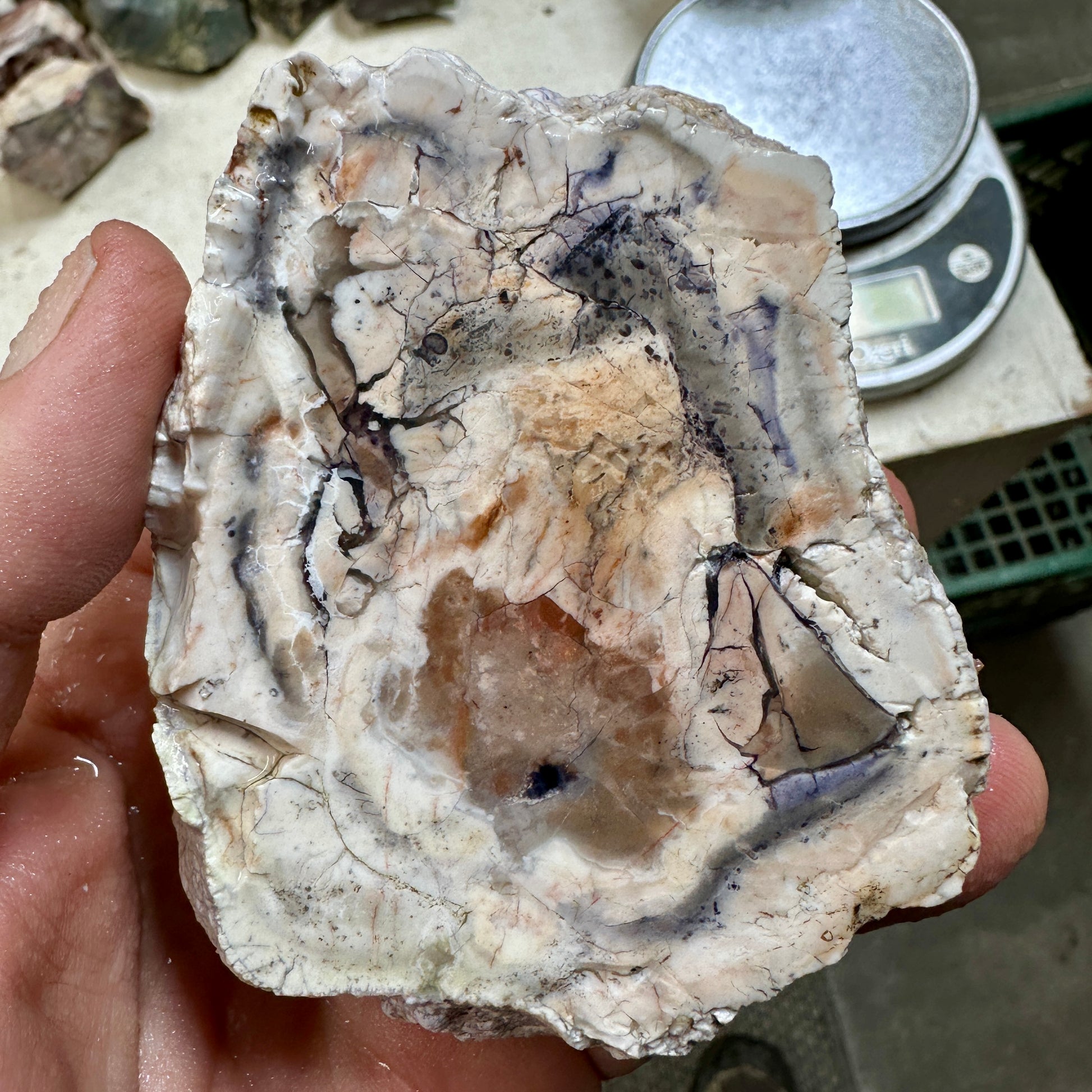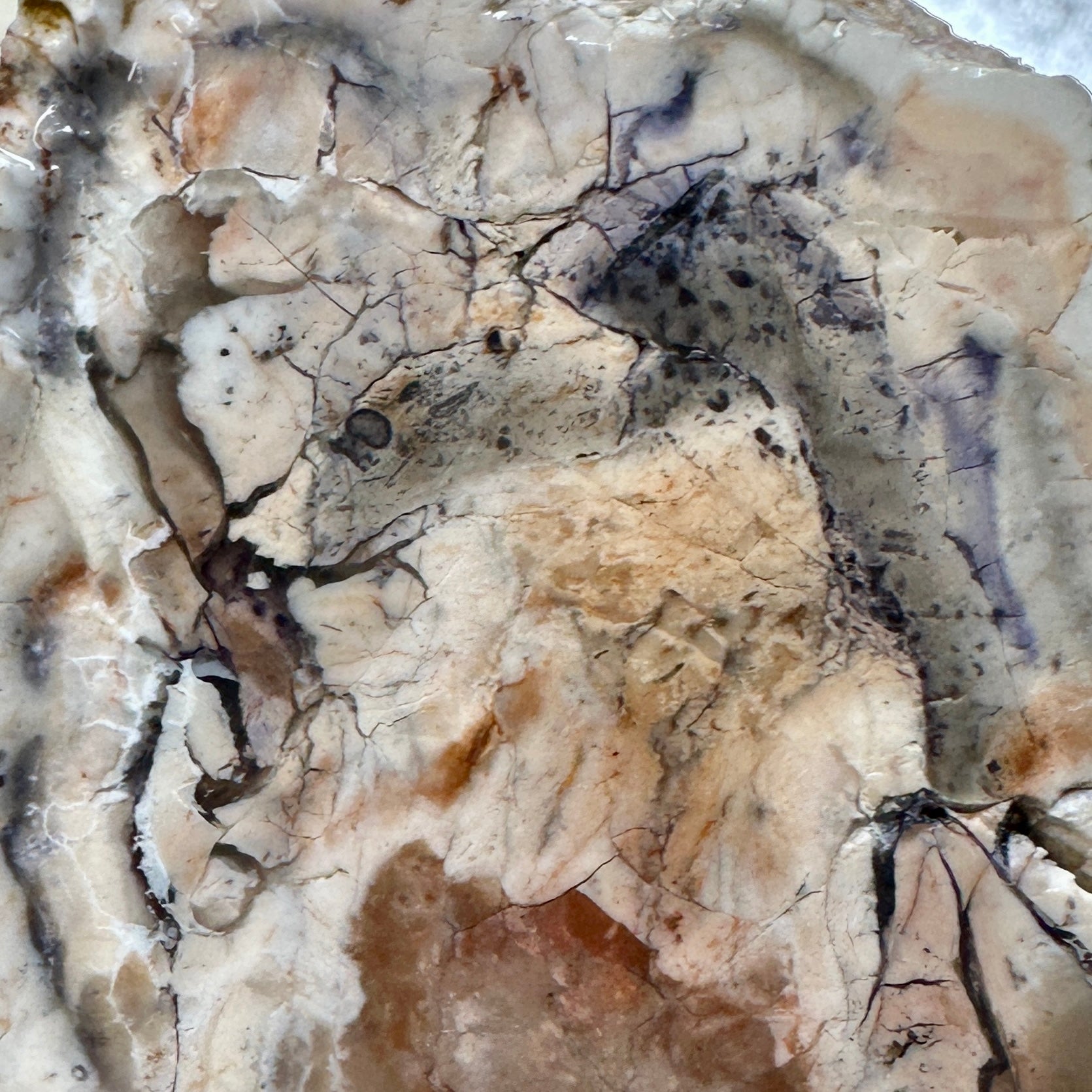 Phenomenal face cut chunk of Tiffany Stone!!! Purple with white and cream inside with a few cracks to note that need sealing. Truly this chunk will cut phenomenal slabs and cabs!!! This is original old stock Tiffany Stone from the pits of the Brush Wellman Beryllium Mine.