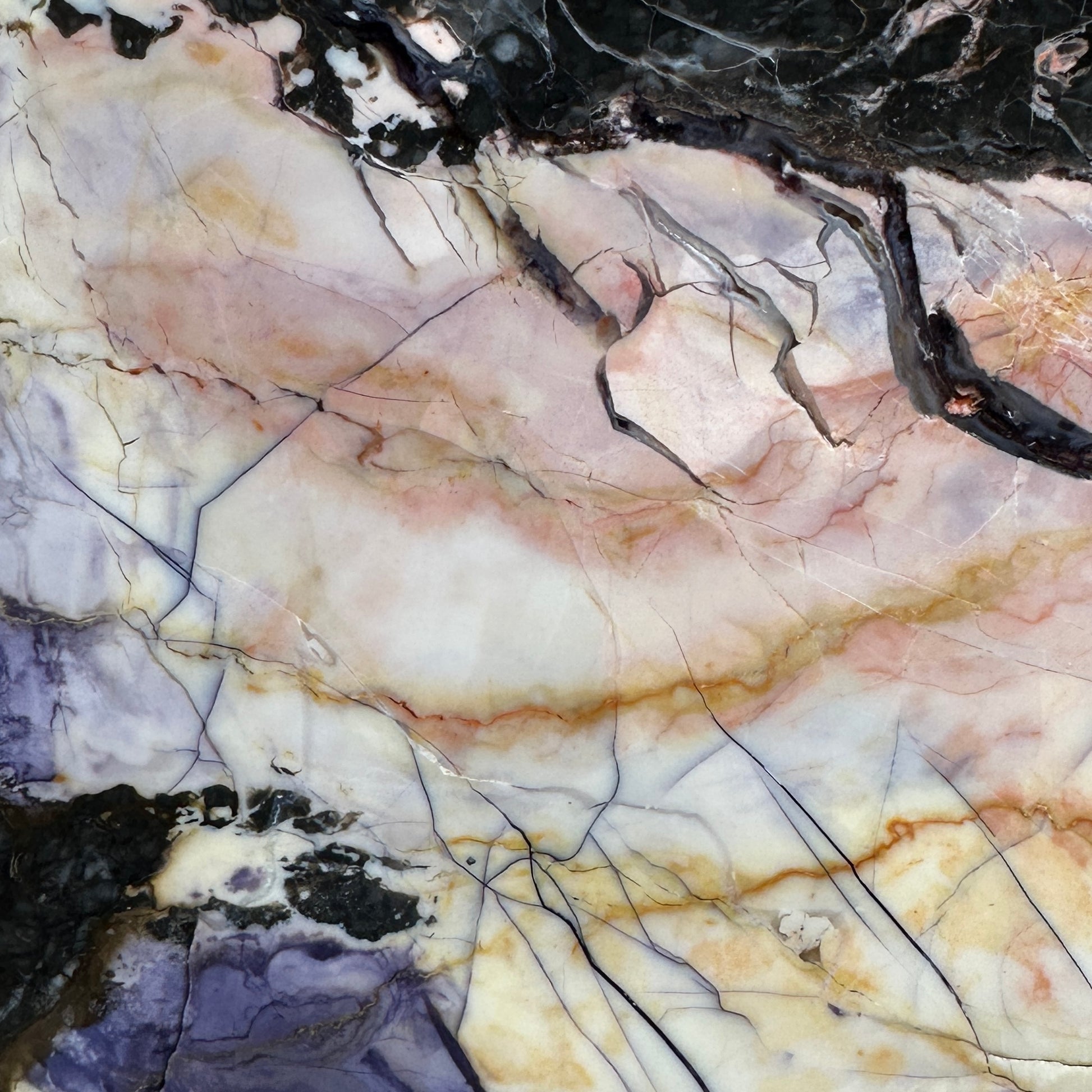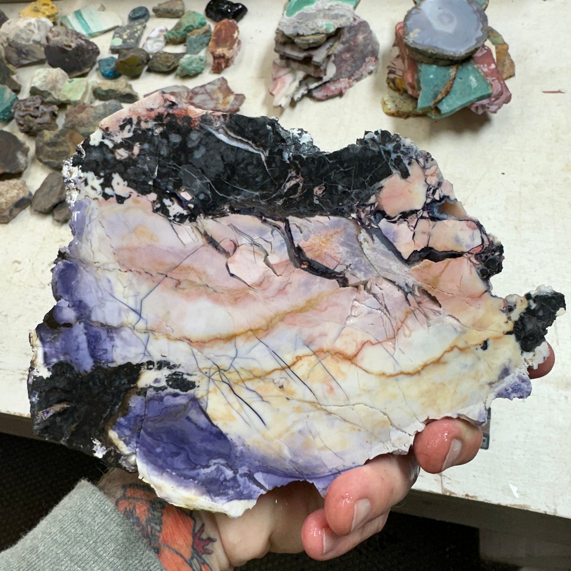 Premium large slice of rare Tiffany Stone stormy with purples pinks, tans, black and whites. It also has an area that has some voids/fractures and i took a dry picture to show you. Would seal up into a huge amazing specimen once polished. Or lots of great cabs can be cut. This truly is a great example for the cabochon cutter OR the collector.