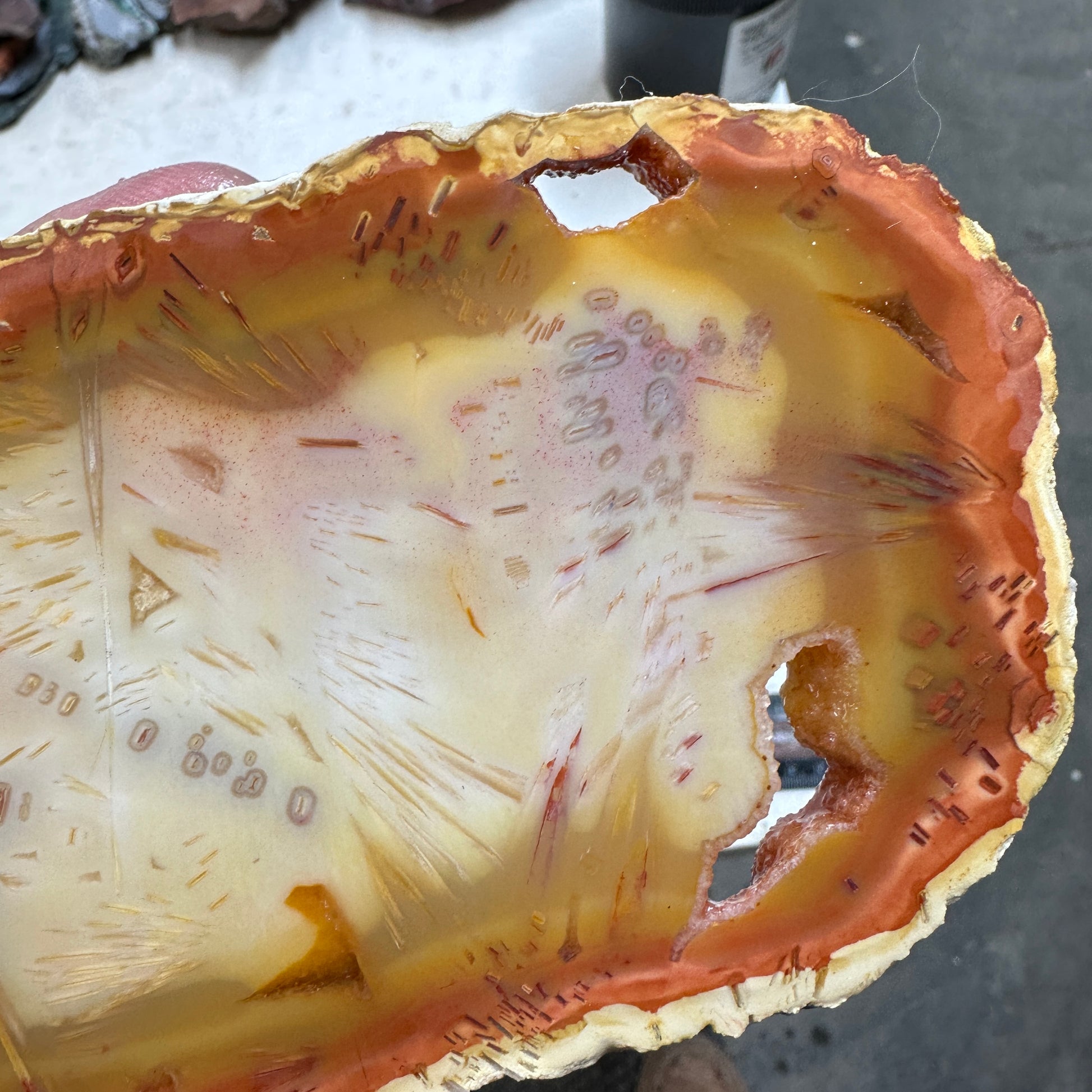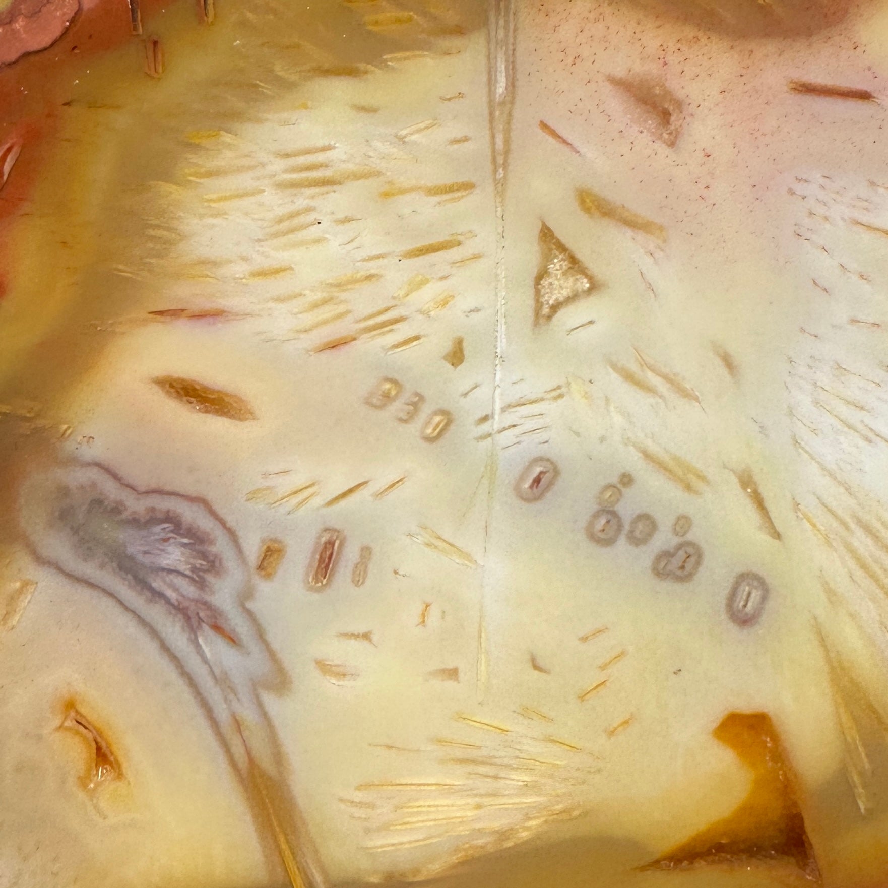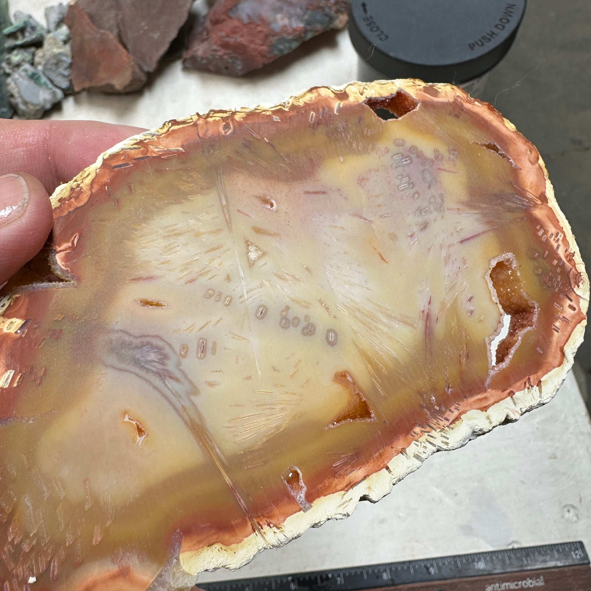 Excellent unique slice of Tube Agate a unique type of stick agate with beautiful sticks and sometimes actual sagenite in a carnelian agate! Smooth with some drusy pockets and very hard: excellent quality for cutting.