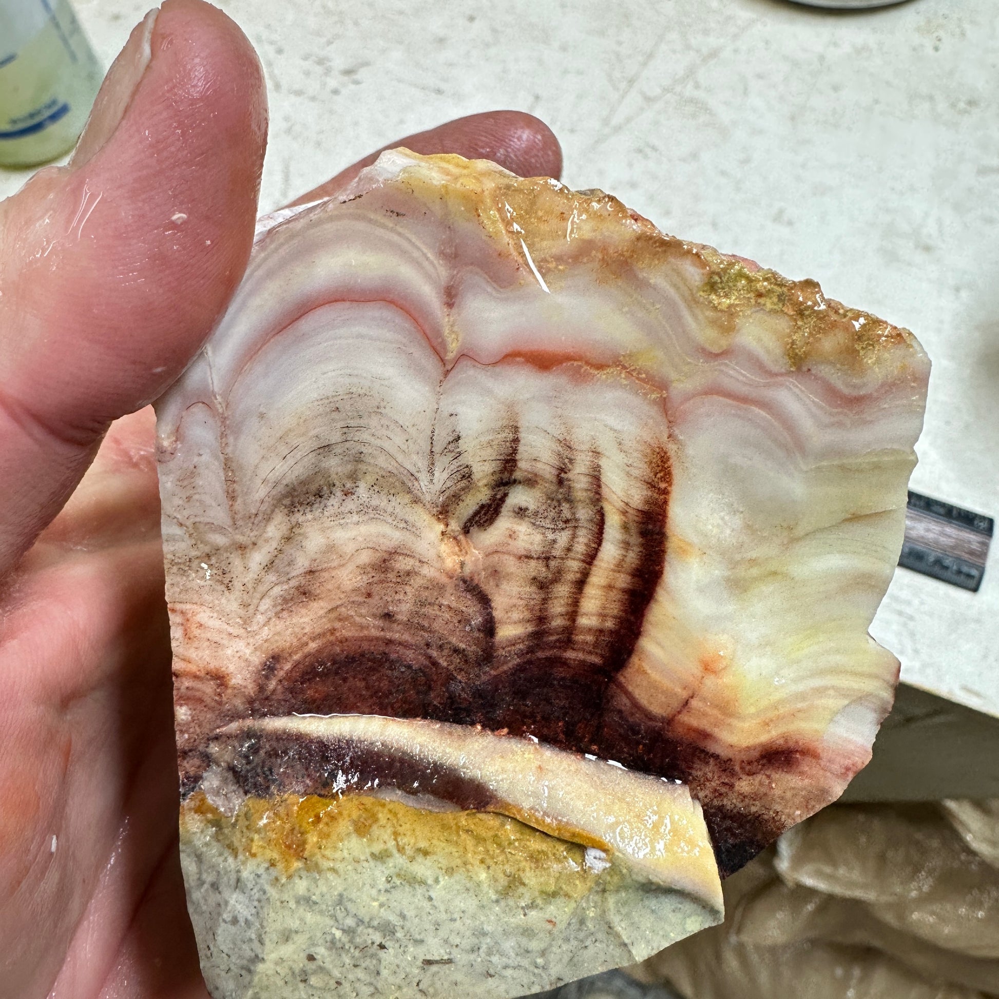 Excellent hand select chunk of Windy Mountain Agate. Kind of an onyx look, an unusual composition: a silicate kaolinite clay bearing gold and silver, and its hard as nails. The pinks are from gold! And blues, greens, greys are from silver! Beautiful pinks, reds, and white bandings. Smooth hard and excellent quality for cutting.