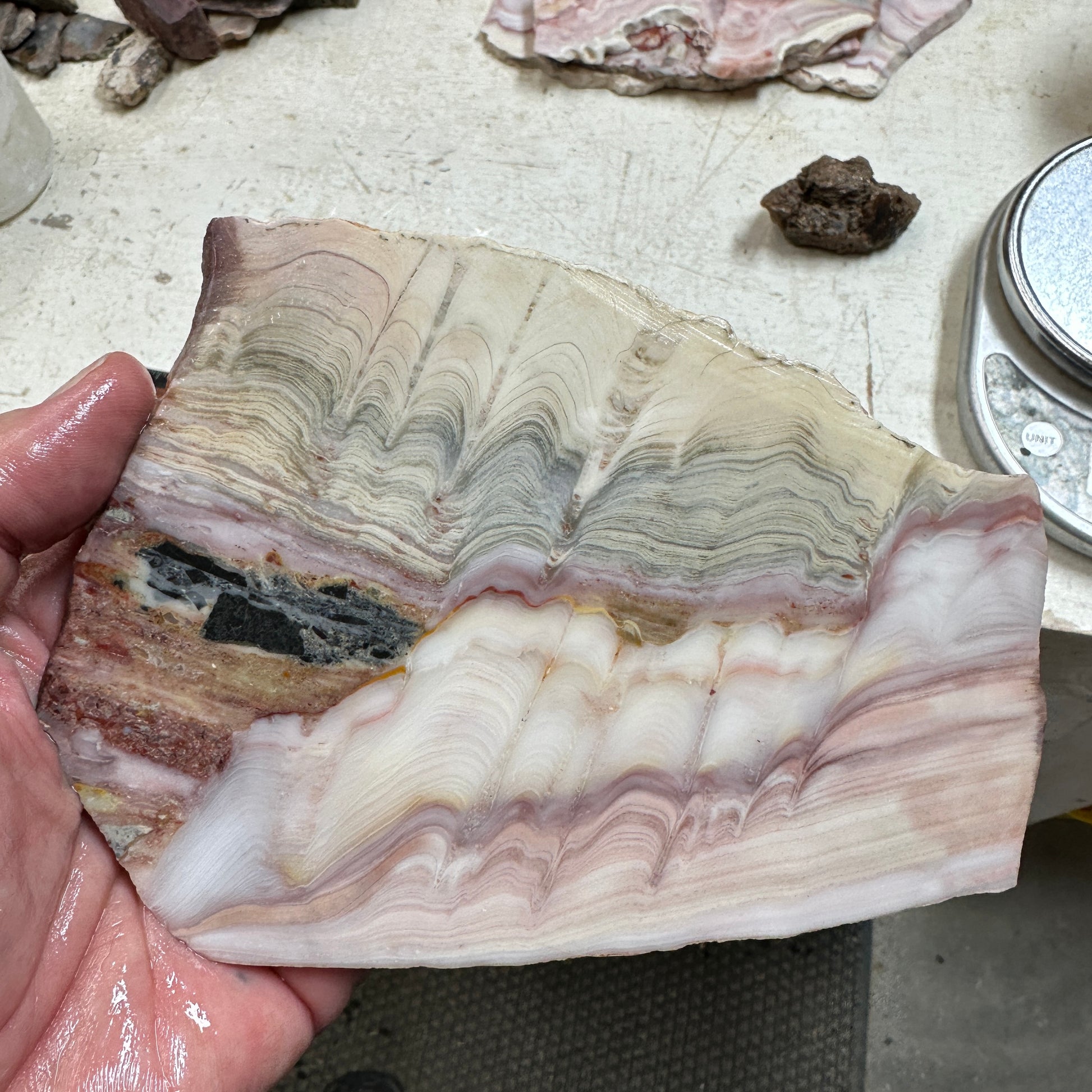 Excellent slice of Windy Mountain Agate. Kind of an onyx look on this variant, a true onyx not calcite and its hard as nails. The pinks are from gold! And blues, greens, greys are from silver! Beautiful pinks, reds, and white bandings. Smooth hard and excellent quality for cutting.