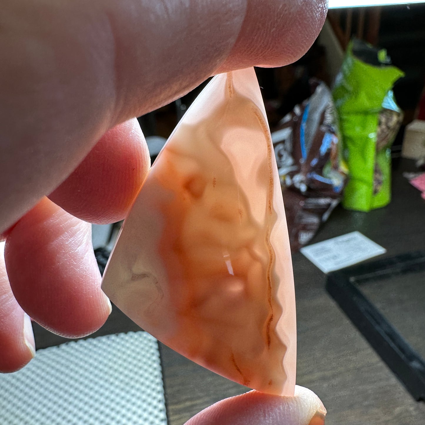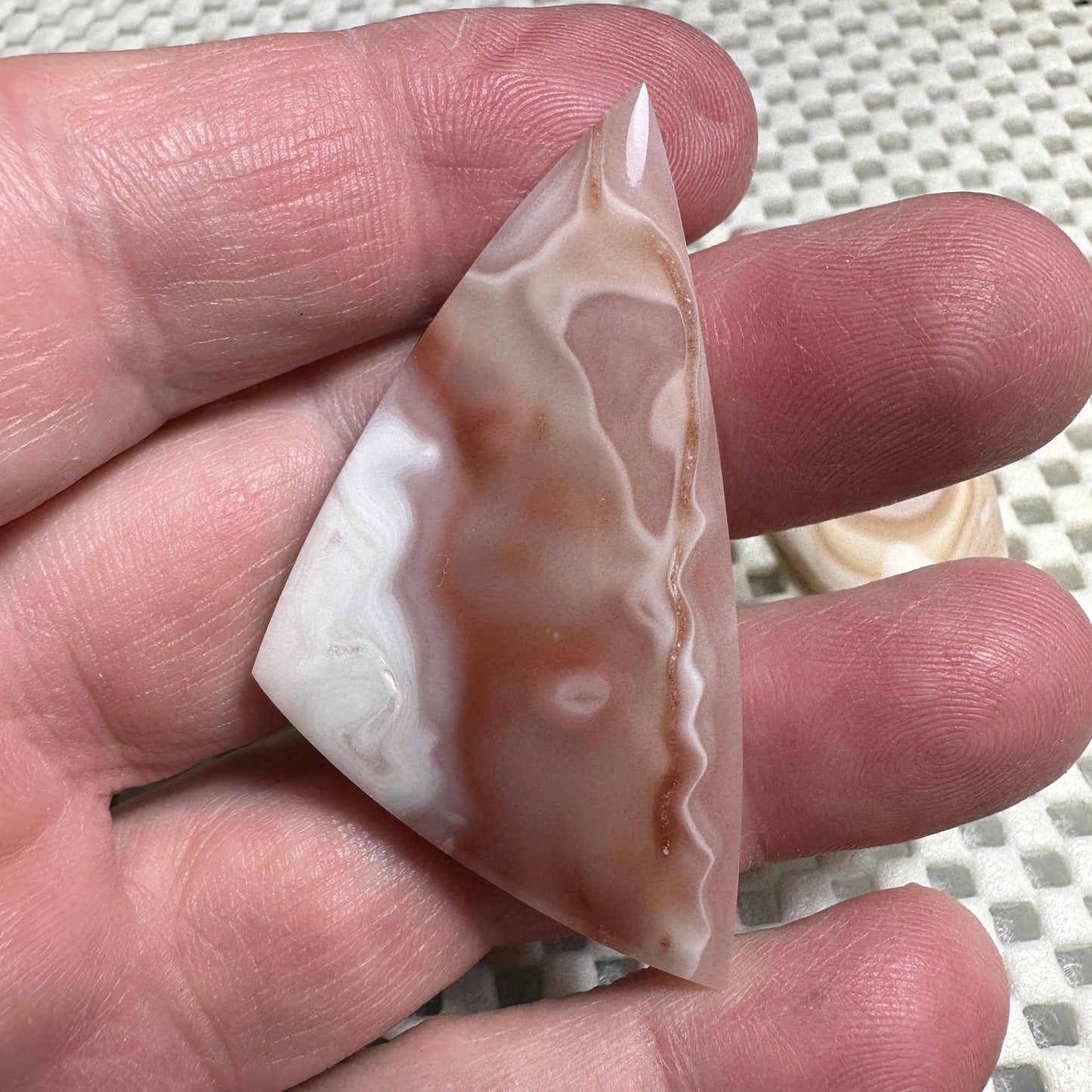 Well polished showpiece cabochon of gorgeous Windy Mountain Jasper out of Nevada showing pinks, reds and whites with a glassy finish and excellent translucency.